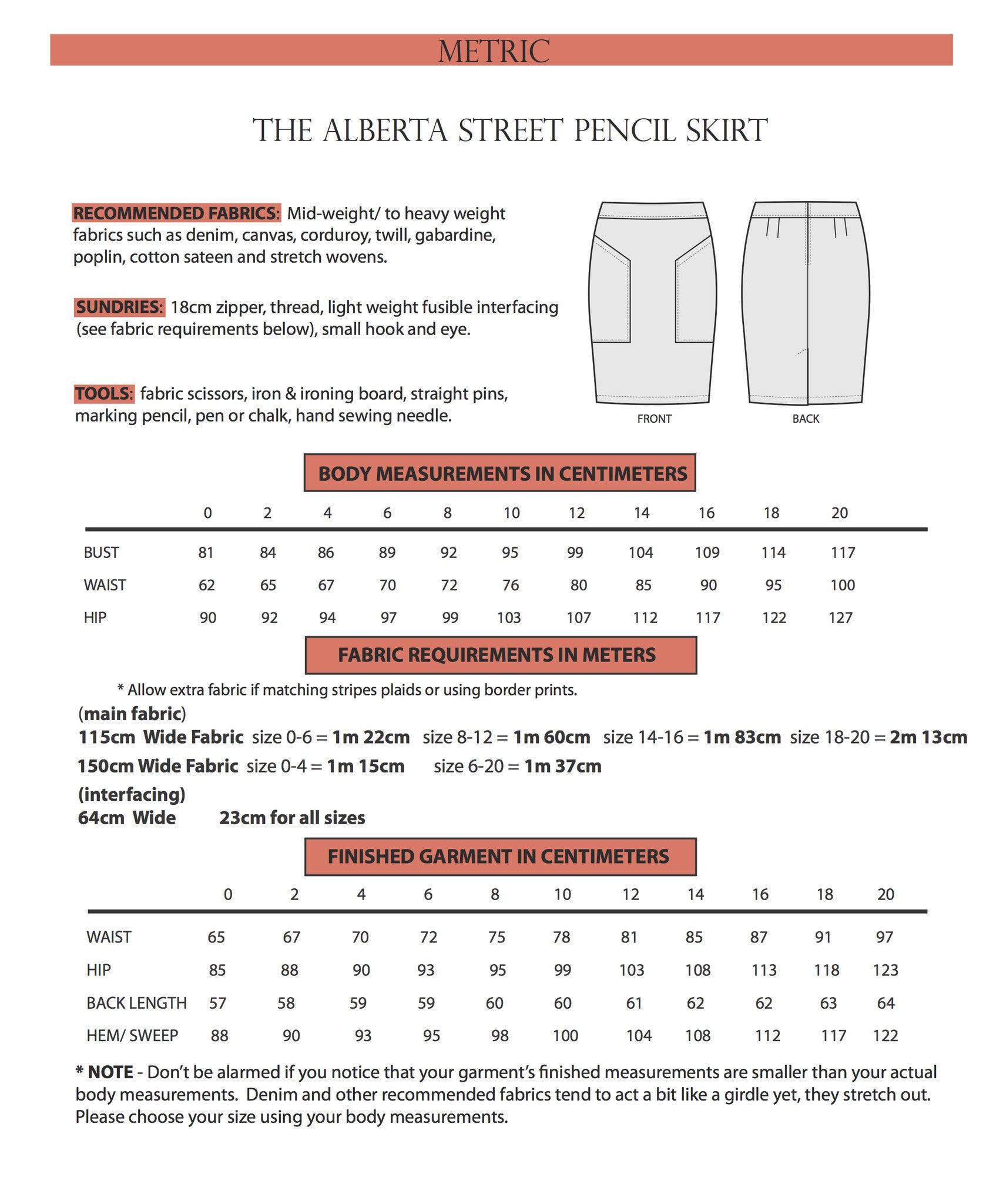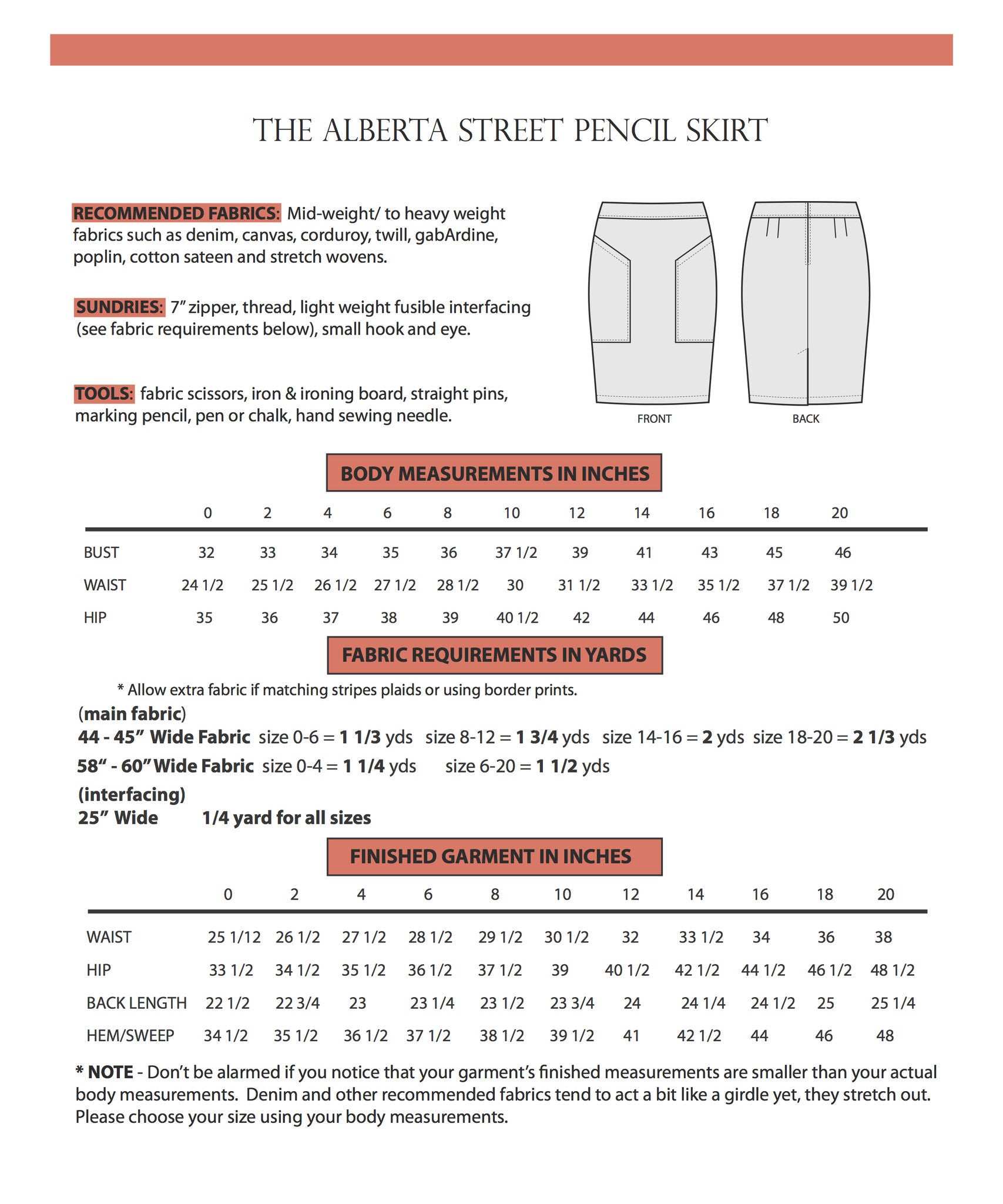 The Alberta Street Pencil Skirt is a great classic silhouette for any season. It is a slim fitting, unlined skirt with little to no ease in the hips with a tapered hem that lands just below the knees. It features a contoured waistband that sits just below the waist, angled and oversized front patch pockets, double back darts, a back vent and center back zipper. The instructions call for a set in back zipper however, an invisible zipper could easily be substituted for an intermediate or advanced sewist.