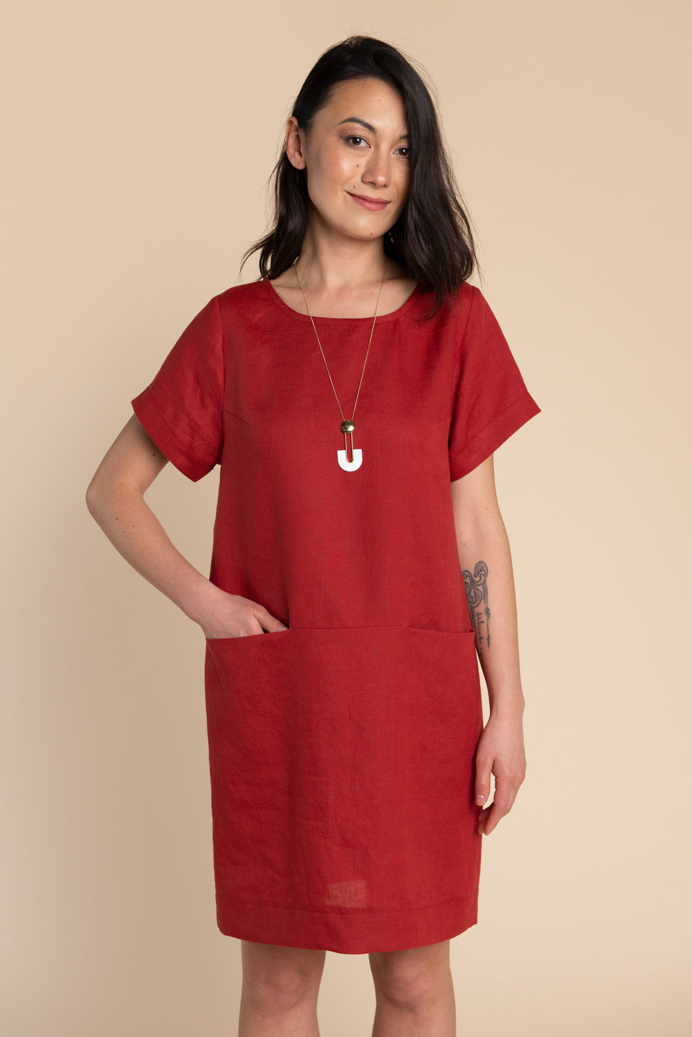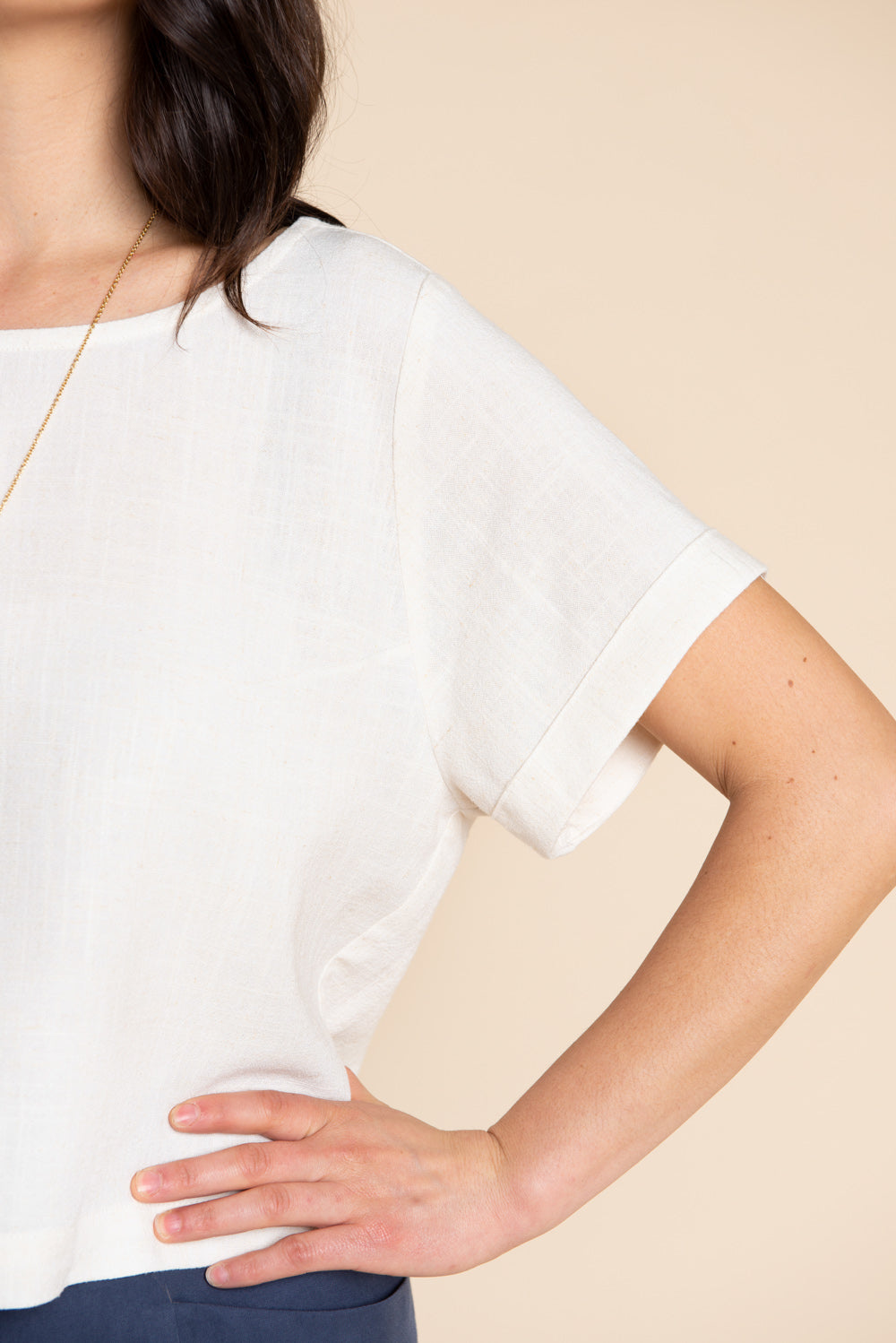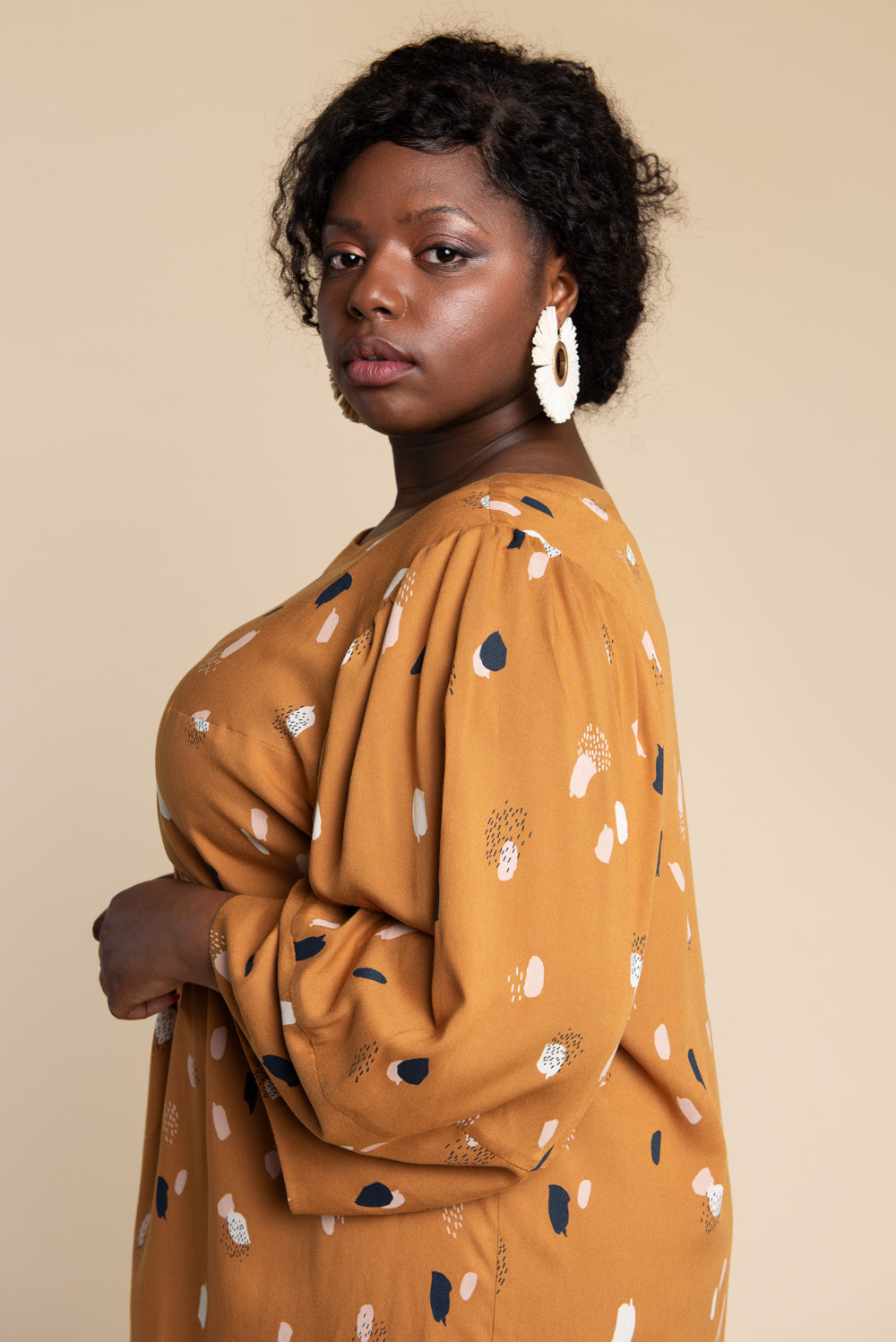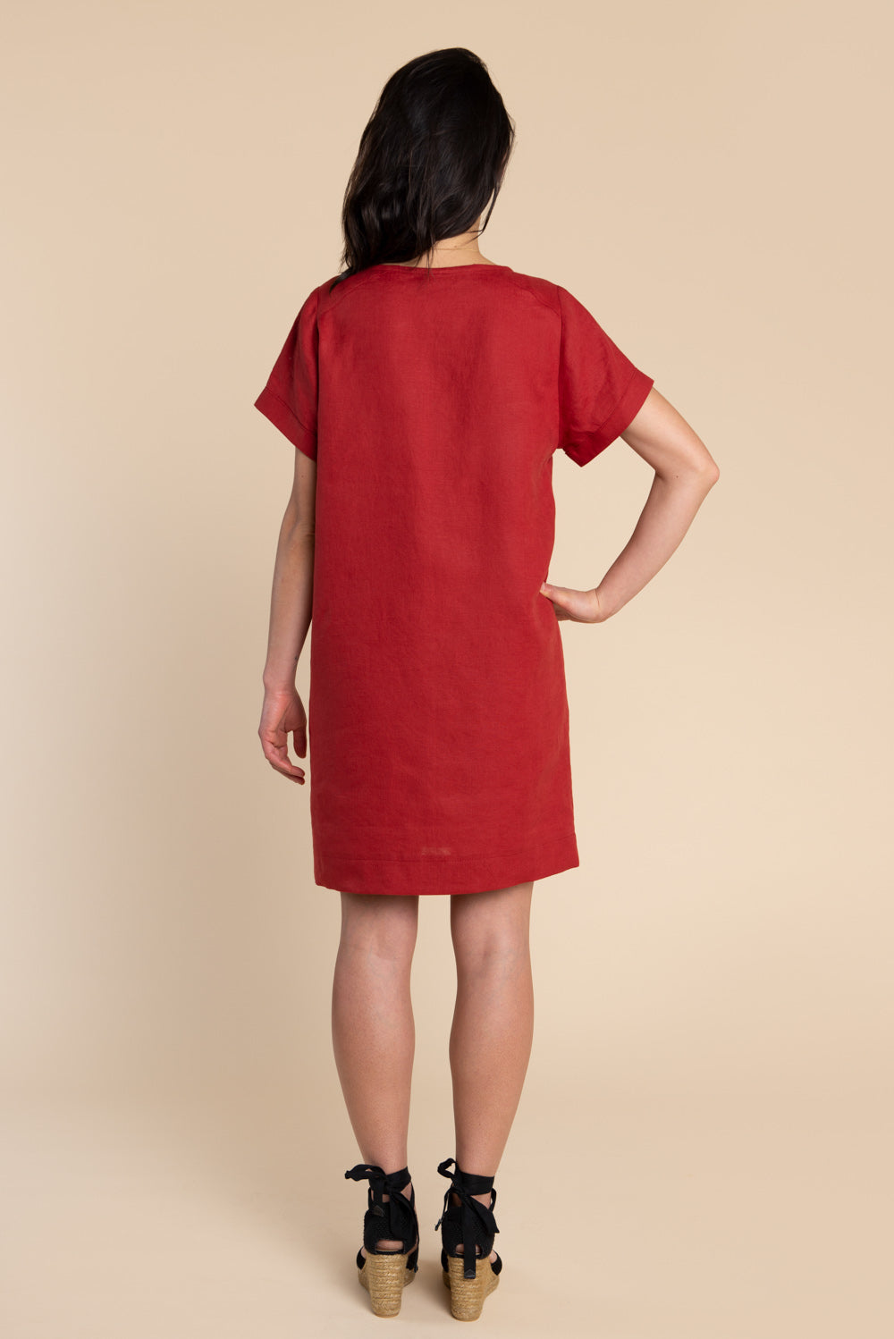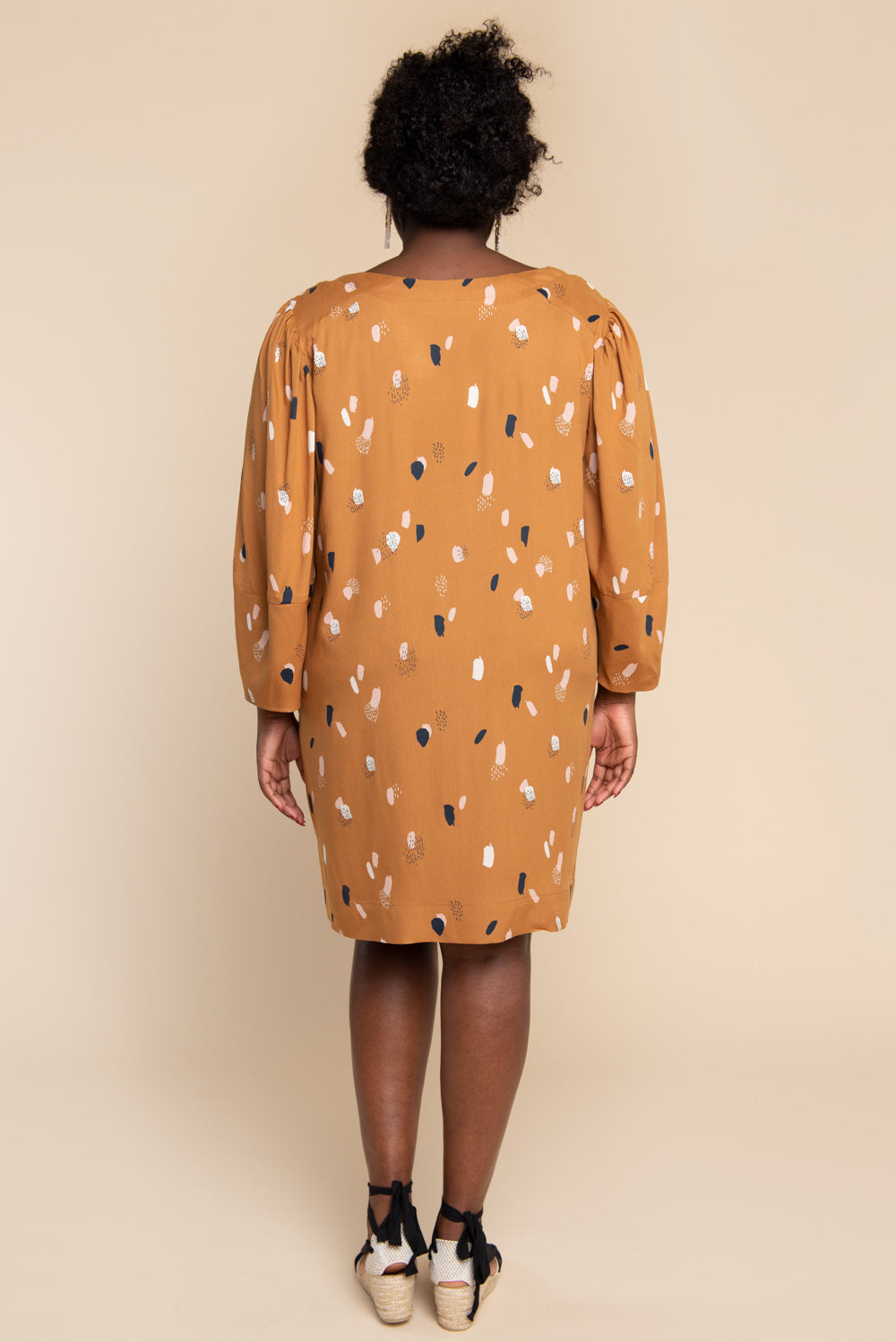 Choose between a semi-cropped top with a cuffed short sleeve (View A) or dramatic gathered long sleeve (View B). Or, make an easy fitting dress with sleek inseam pockets (View C), or without pockets (View D). All views have a slightly dropped shoulder, angled shoulder yoke and roomy fit, with a choice between an elegant bias binding or faced neckline finish.