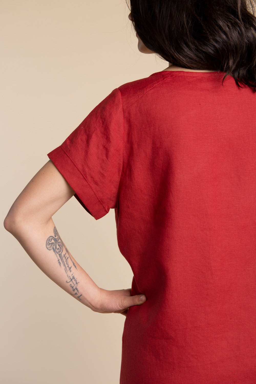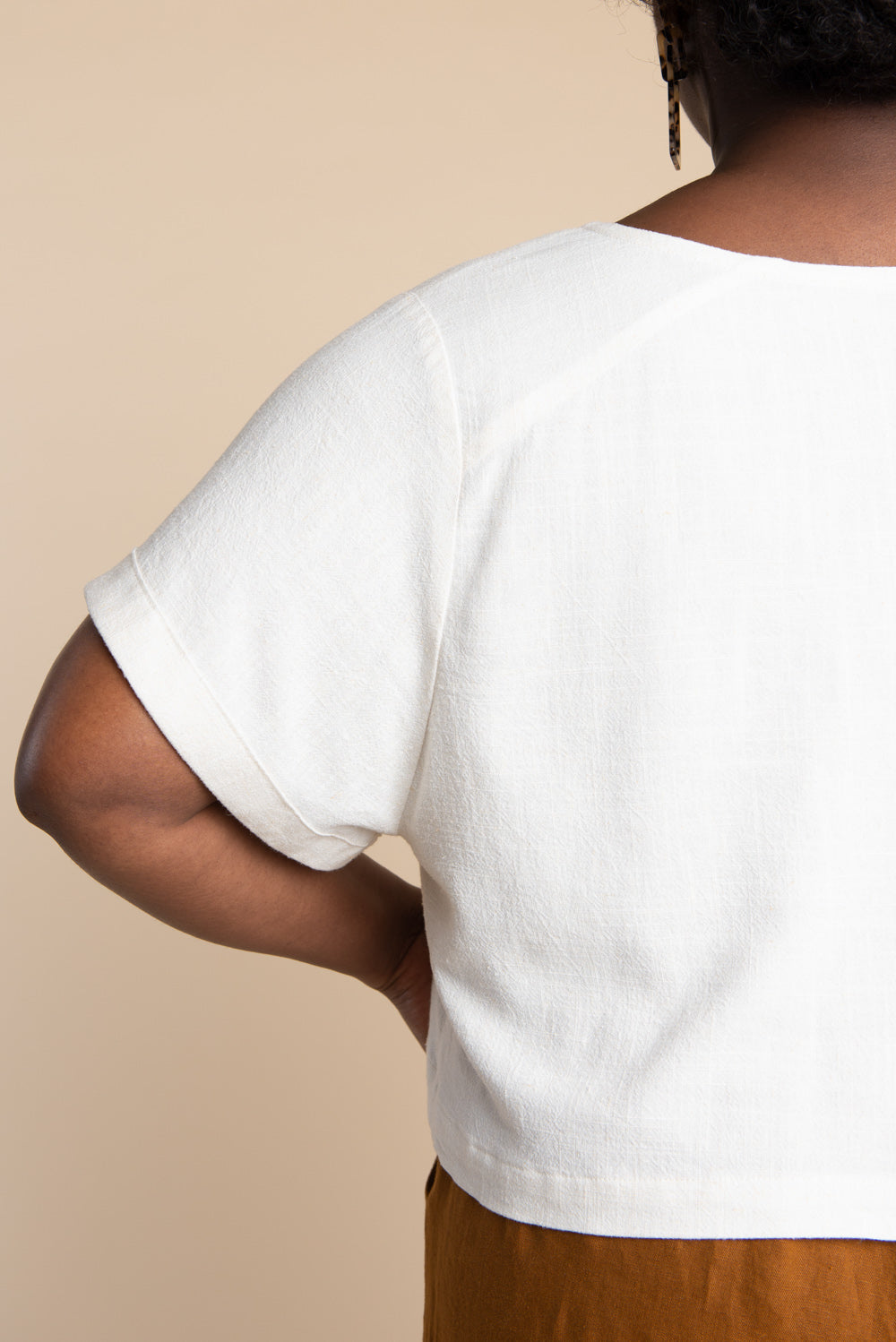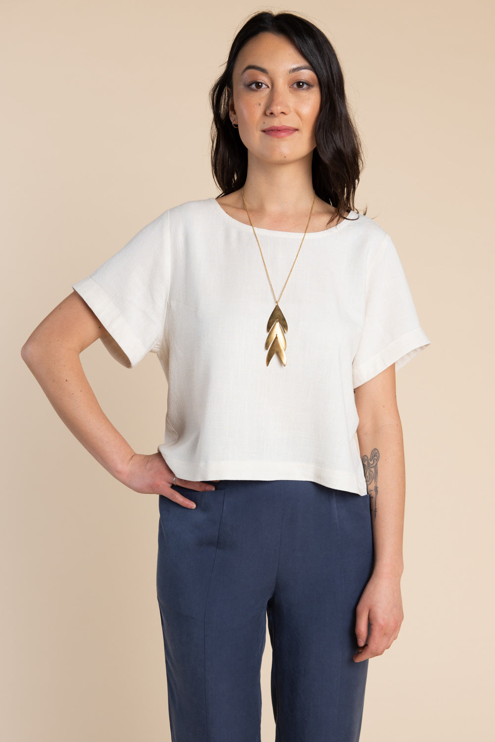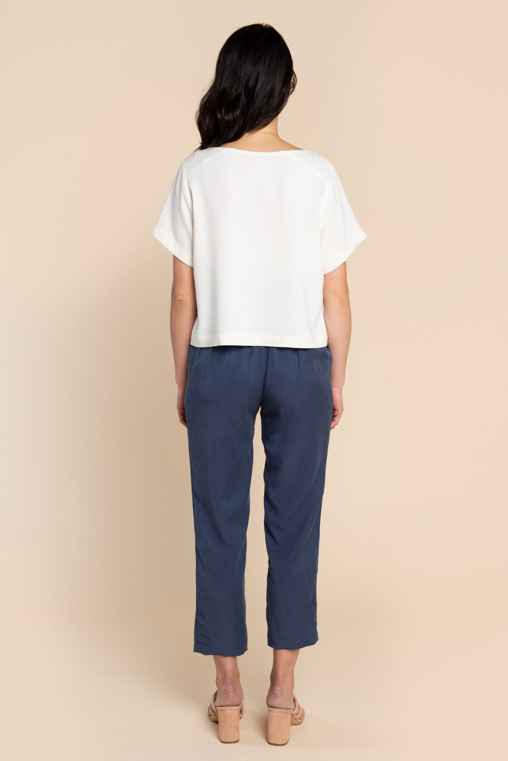 This pattern can be made with a variety of fabrics depending on the desired effect. For a more structured shape, use light to medium weight wovens such as linen, chambray, or cotton shirtings. For a drapier effect, use rayon challis, tencel, cotton voile or silk.