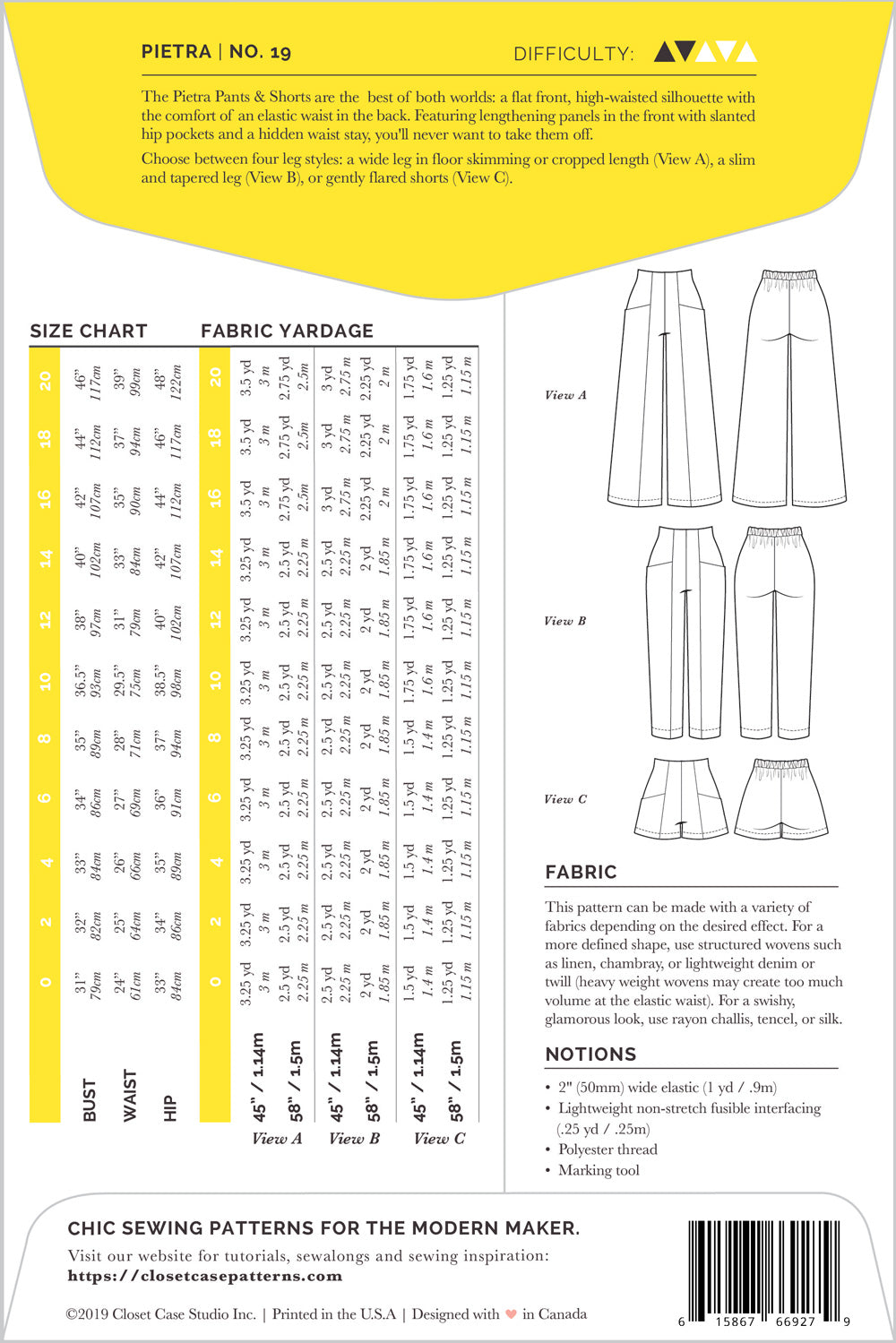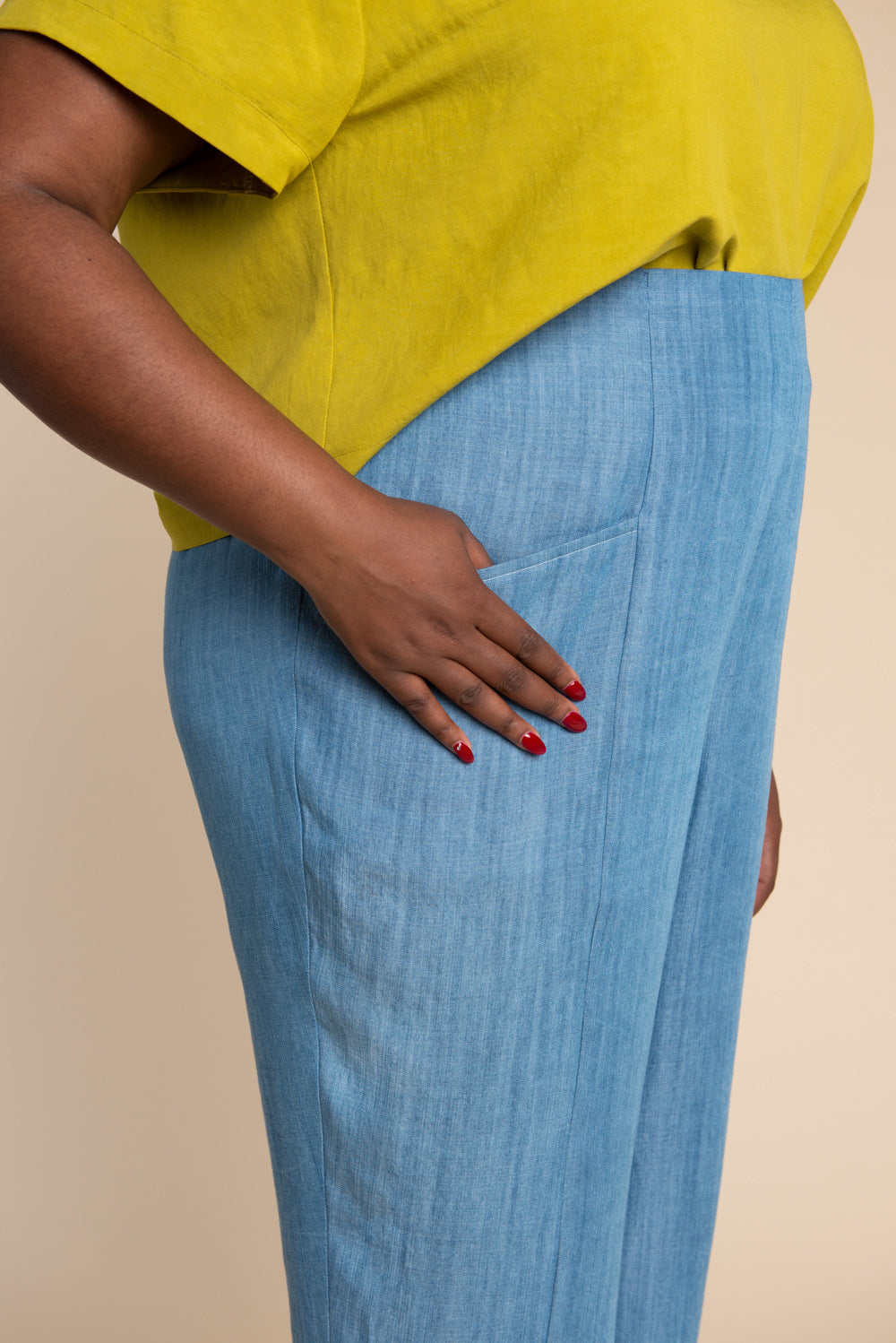 This pattern can be made with a variety of fabrics depending on the desired effect. For a more defined shape, use structured wovens such as linen, chambray, or lightweight denim or twill (heavyweight wovens may create too much volume at the elastic waist). For a swishy, glamorous look, use rayon challis, tencel, or silk.