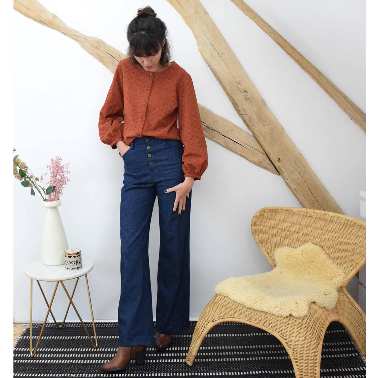 Fluette pants are worn at the waist. Fluette is a flared style with rounded front and patch pockets at the back to give it a seventies look.