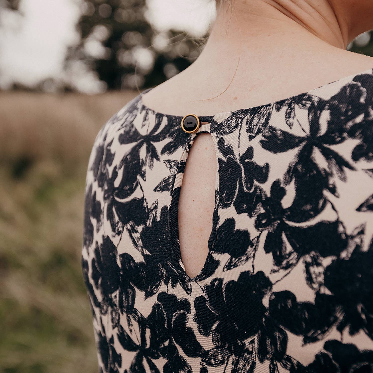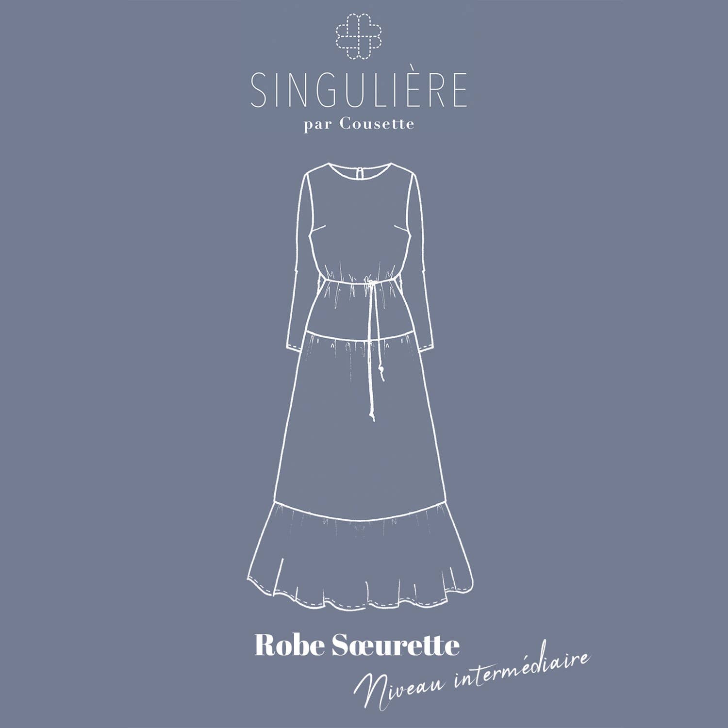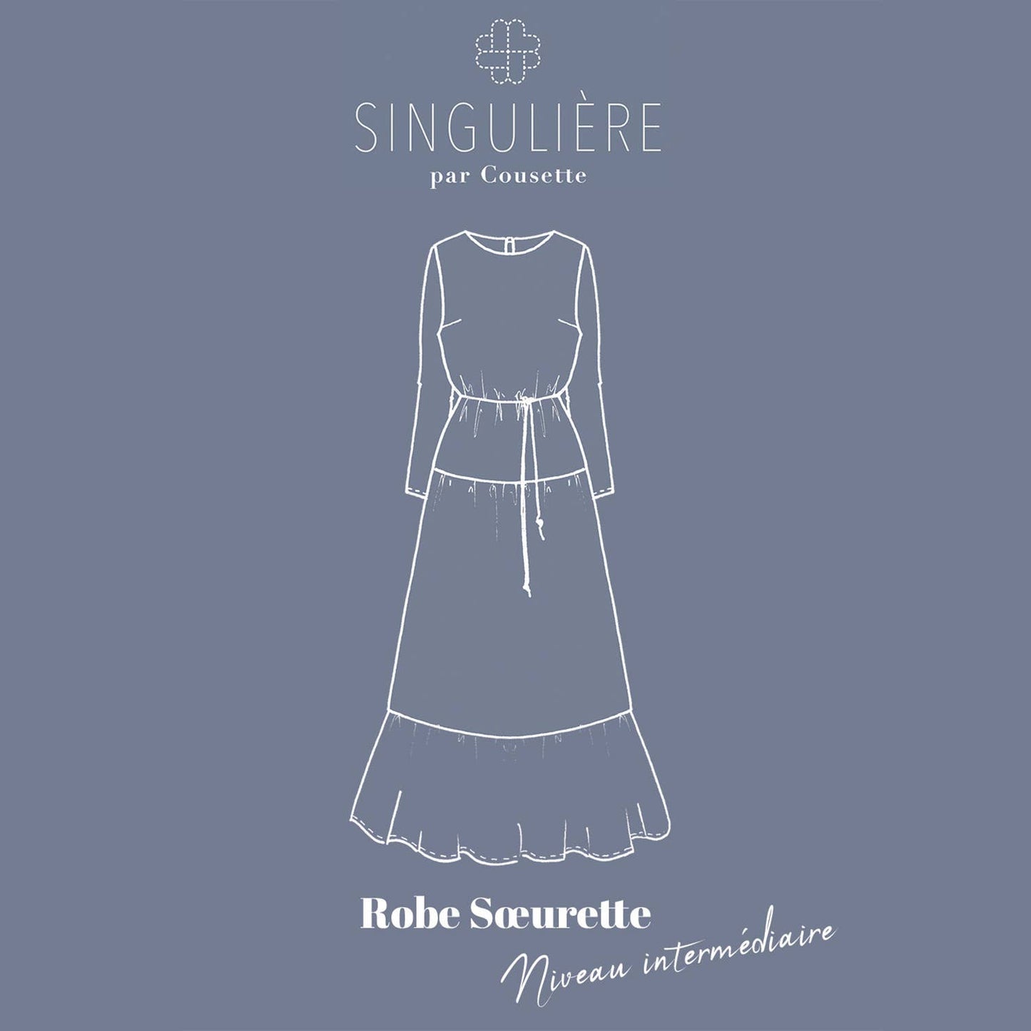 Soeurette is a straight, low-waisted dress with a dreamy, romantic feel. The bodice is structured by two chest clips while the slightly flared skirt is ruched and has a straight ruffle at the bottom. The sleeves are fitted and adjusted to give balance to the silhouette. The neckline is finished with siding. A slit in the middle back closes with a strap and a button. Sœrette can be worn as is or with a belt.