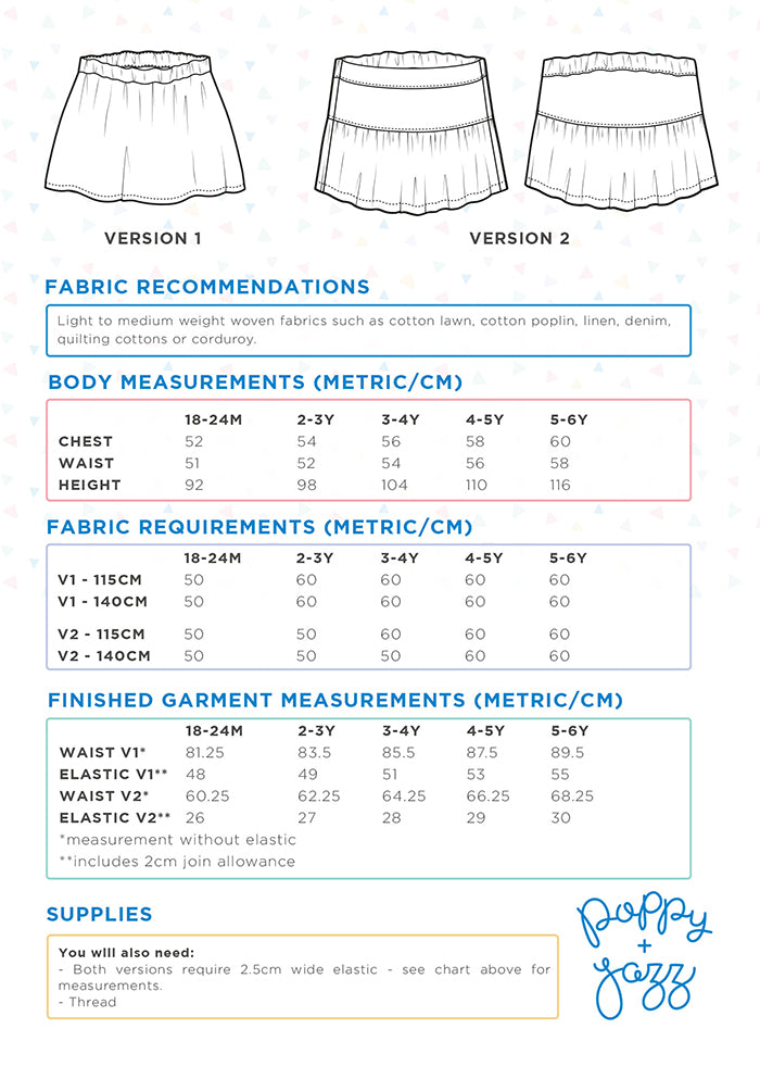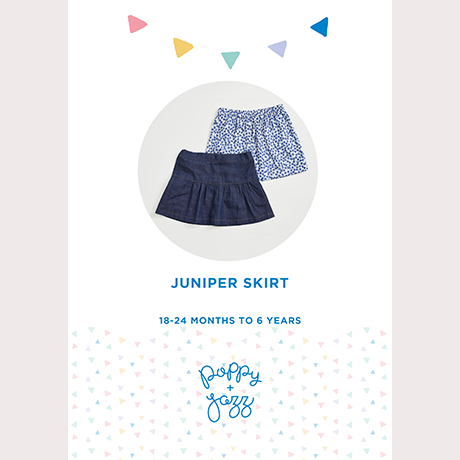 The Juniper Skirt is designed for children from 18 months to 6 years. See the chart for details on fabric requirements.