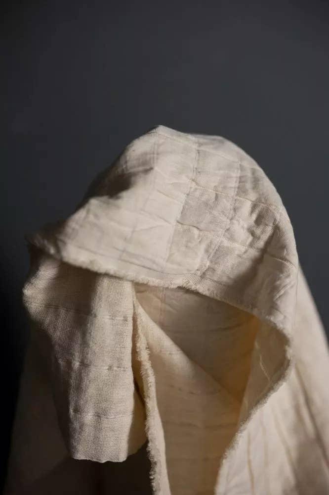 A natural ecru colour, this layered cotton has a jacquard weave that gives it a quilted look and feel. The reverse is a gauzy cotton, there is no batting in the middle of this cloth, the inside is made up of a series of thicker yarns which gives it the quilted feel. The top is a fine cotton. To help prevent fraying, overlock the raw edges before sewing.