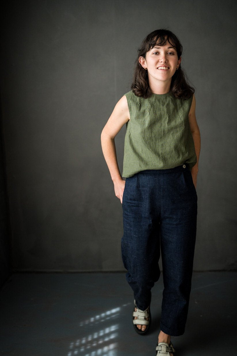 The Eve Trousers are suitable for a wide range of fabrics so make it your own. Medium woven fabrics such as cotton twill, denim, corduroy, light to medium weight woolens, linen or tencel. Picking a thicker fabric like a canvas will give you a more structured shape, like the orange pair in the image gallery.