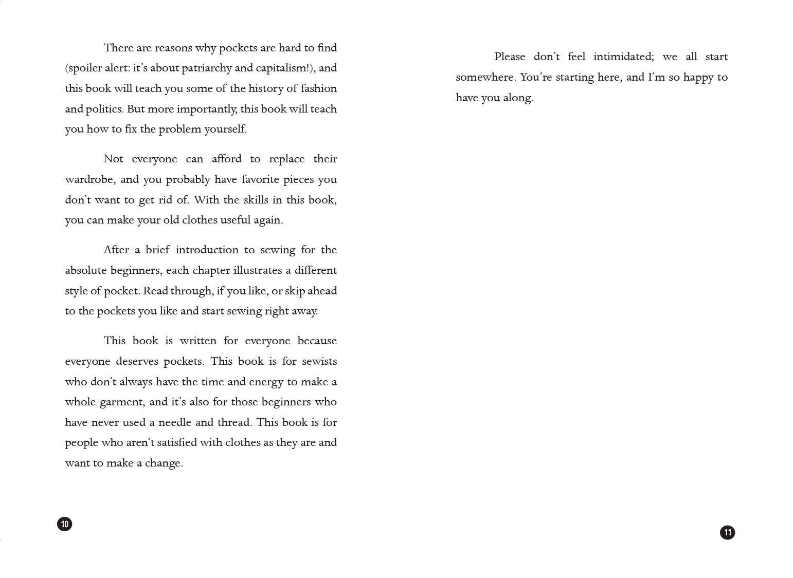 What a fantastic little book. The opening chapter is a short and entertaining history of pockets and why they remain a political tool today. Then, you'll find the real joy in the following chapters. There you'll find instructions for six of the most popular and versatile pockets. Straightforward instructions on how to add them to patterns and clothes that don't already have them.