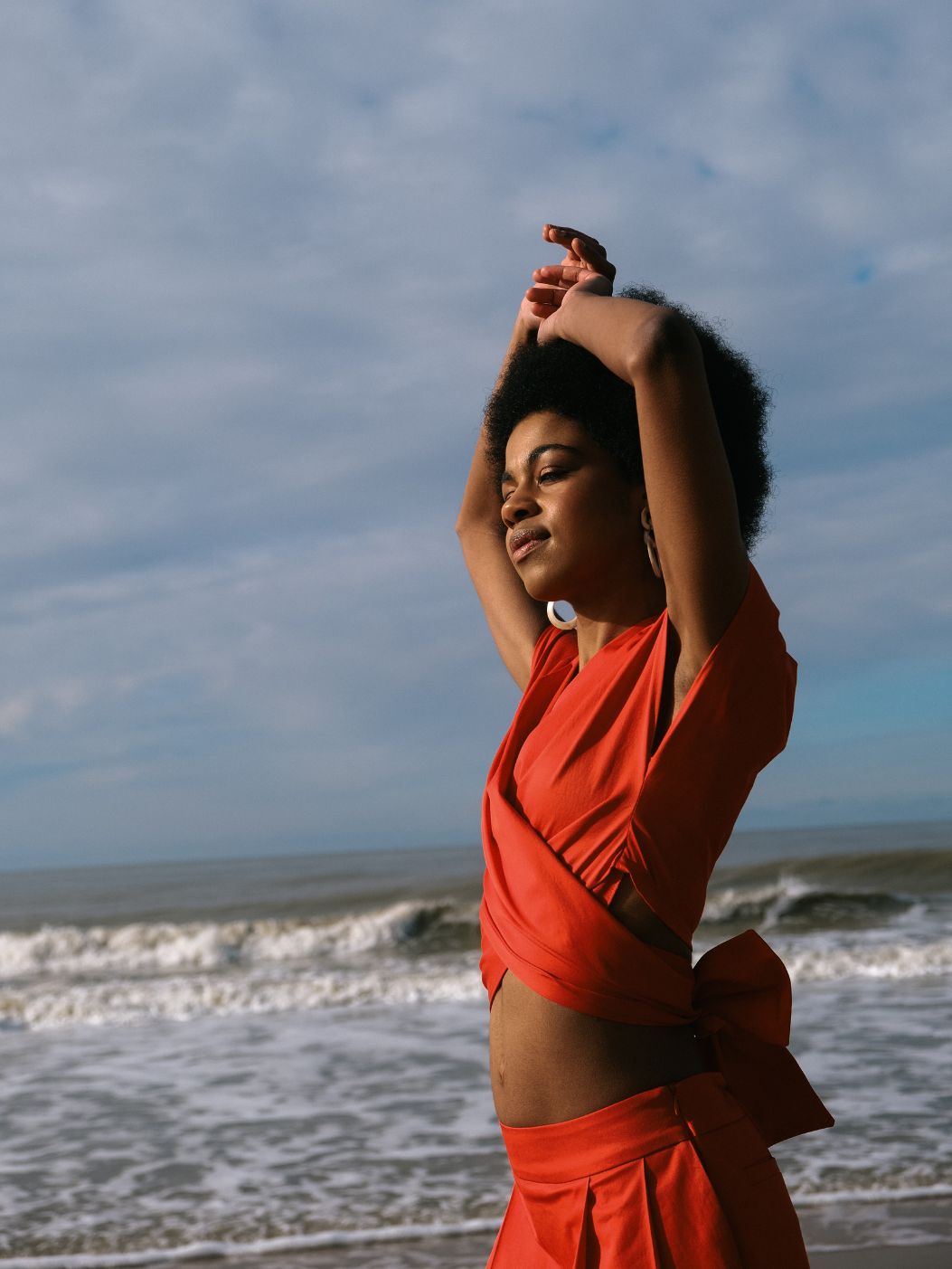 Suitable for both woven and knitted fabrics. You will get a nicer wrap effect from a fabric with good drape. Choose light fabrics for a summer version, or fabrics with a bit more heaviness and warmth for winter. Avoid thick and and stiff fabrics as they will create bulk when wrapped.