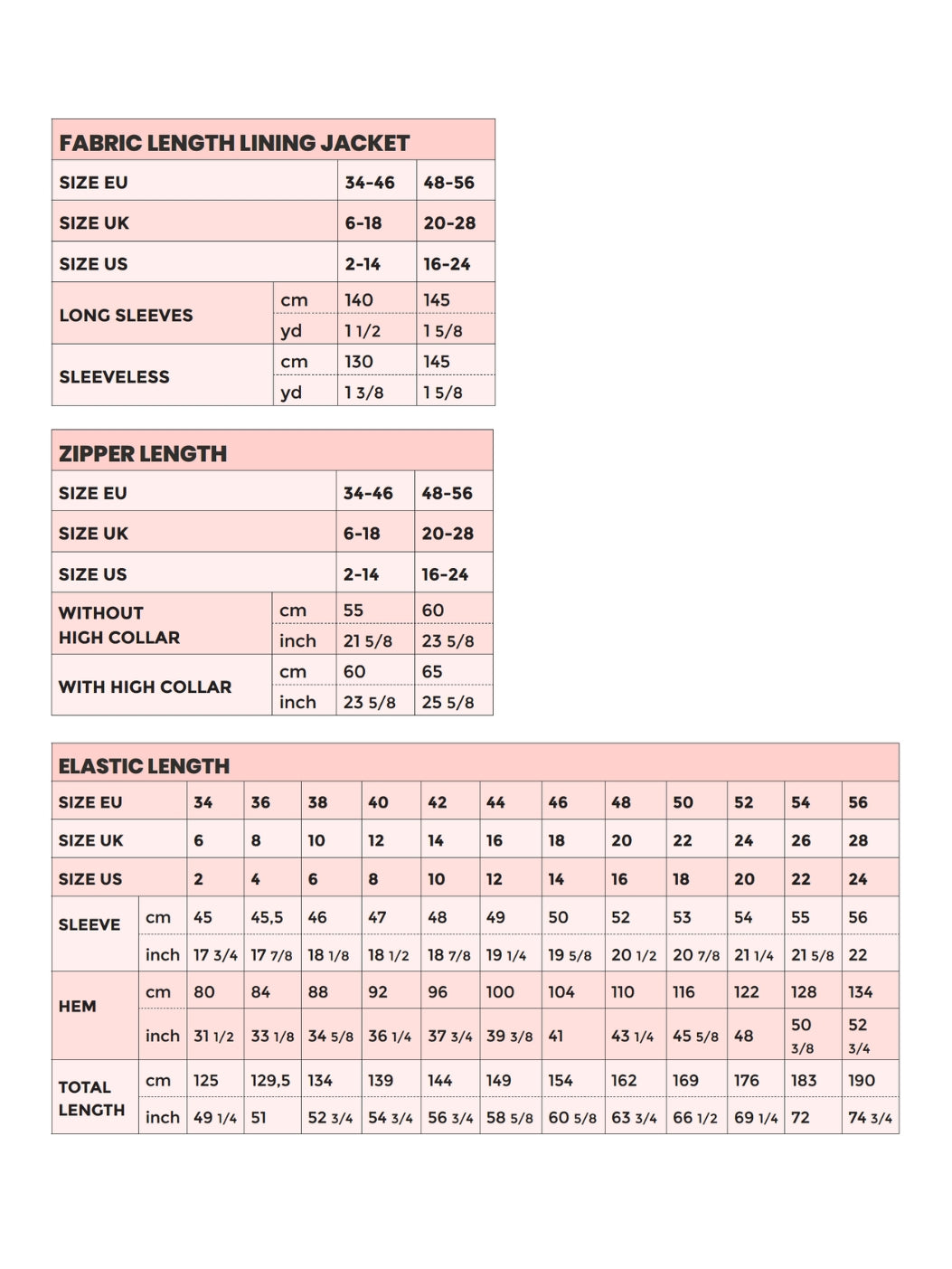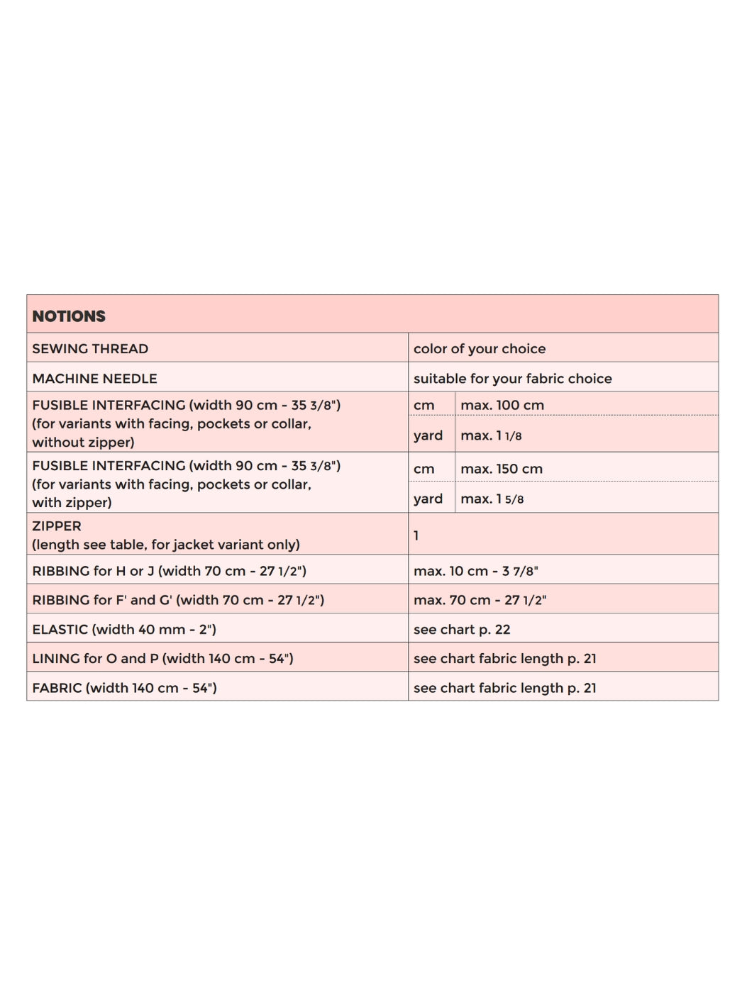 This is a versatile pattern that can be made with a range of fabrics for different looks. If you use a thick fabric, it is recommended to make the zipper placket and facing parts in thinner fabric. For the zipperless sweaters, keep in mind that your head should be able to pass through the neck opening, so the collar will need to have some stretch. The collarless jacket option would look great in wool.