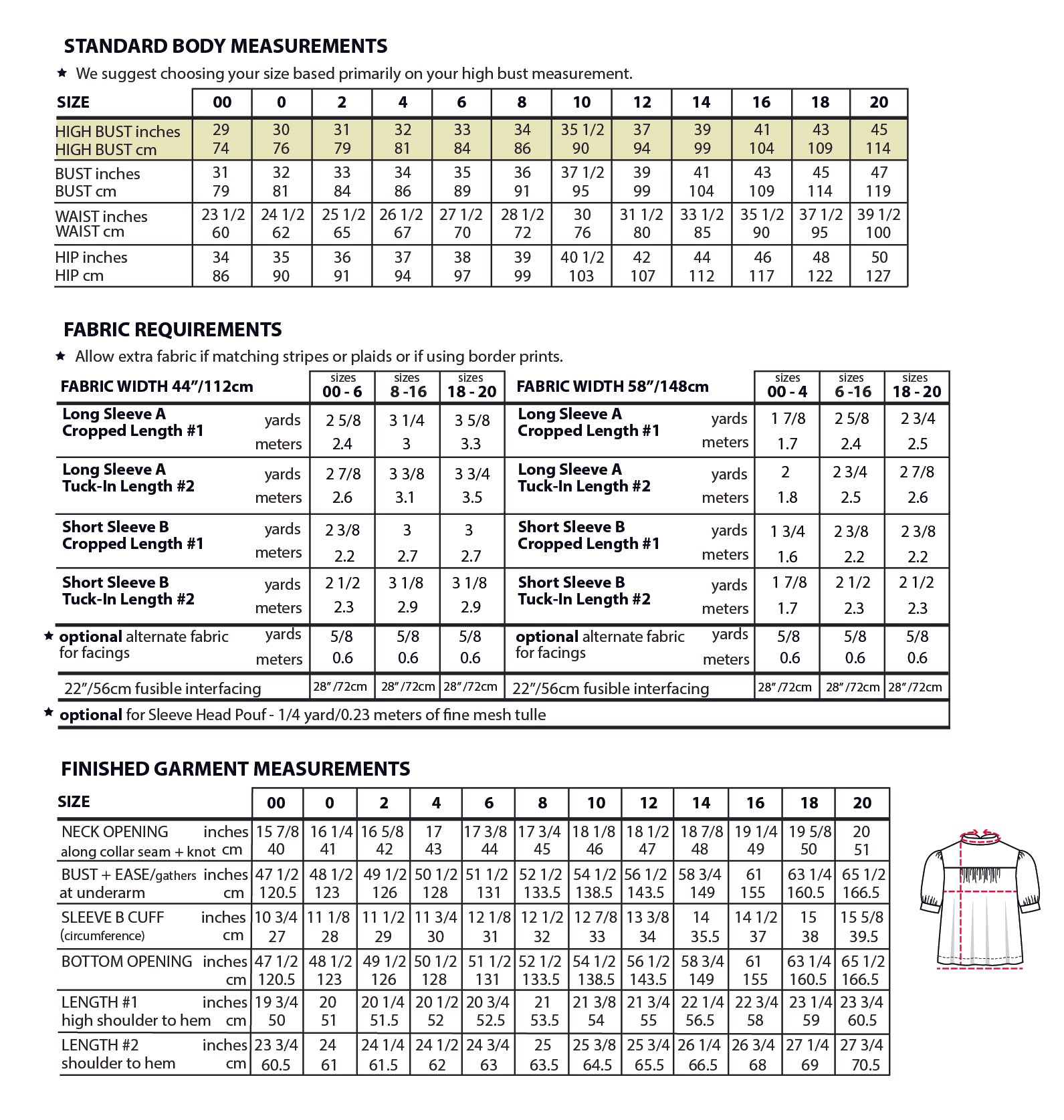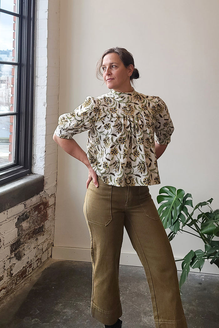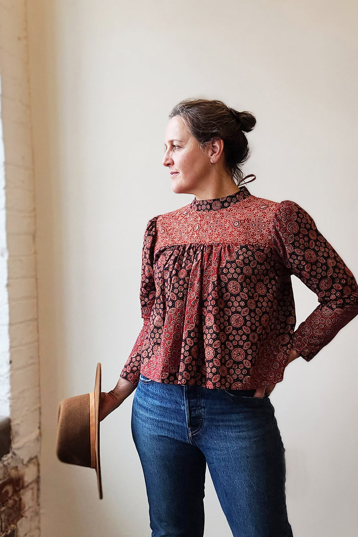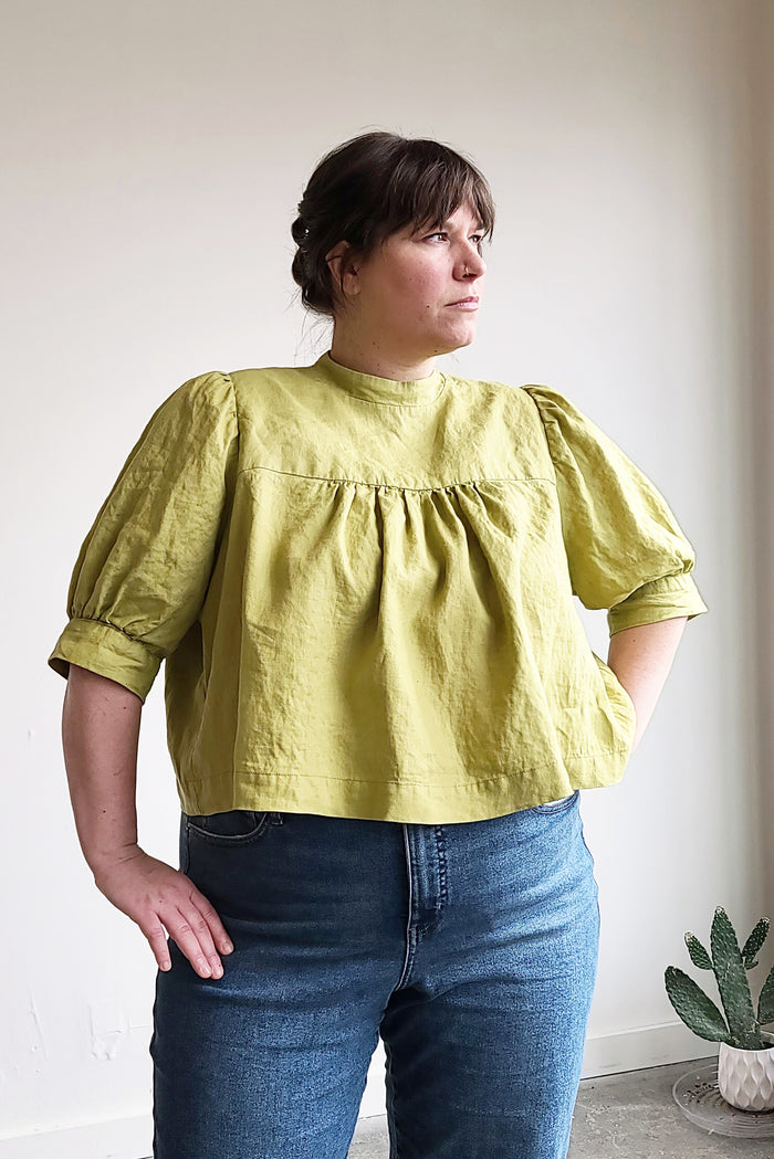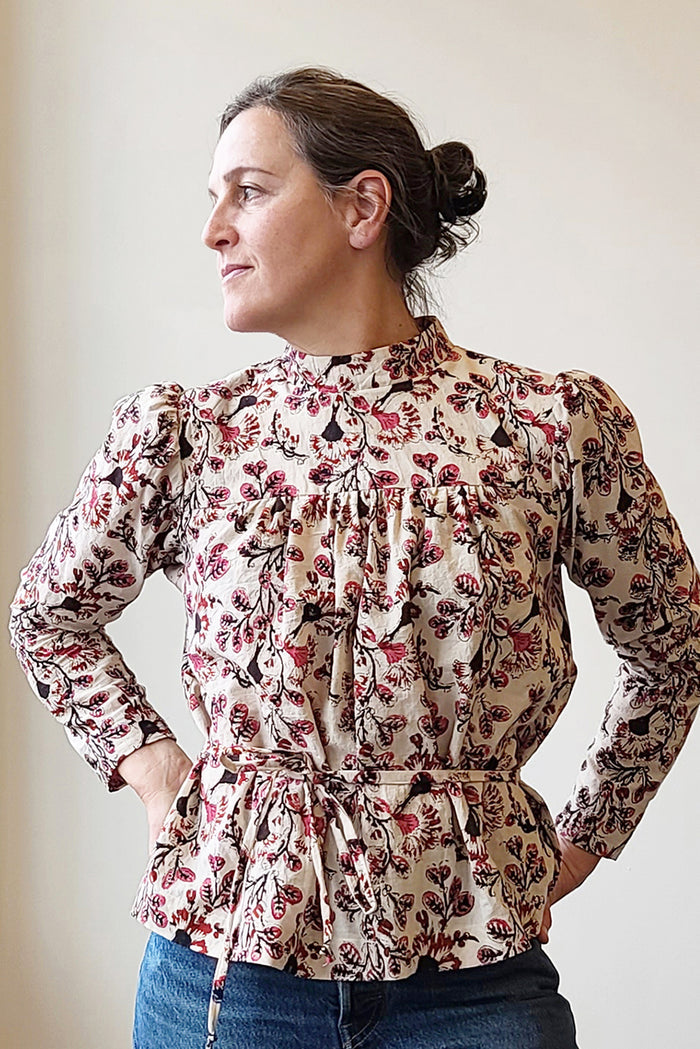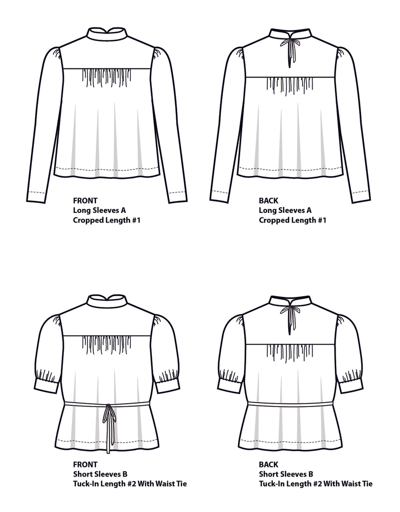 A timeless blouse with gathered sleeves, a stand-up collar, front and back yokes, gathers at centre front and back lower bodices, a back keyhole opening with tie closure.