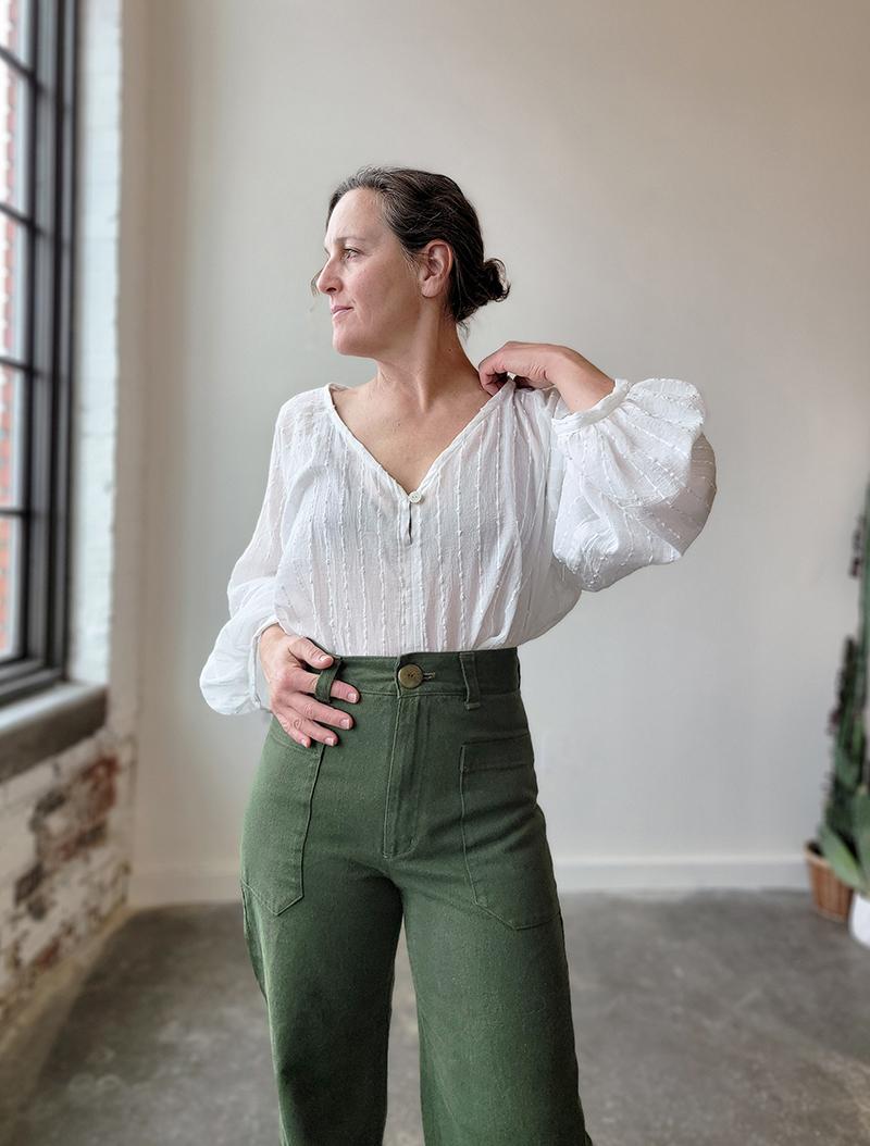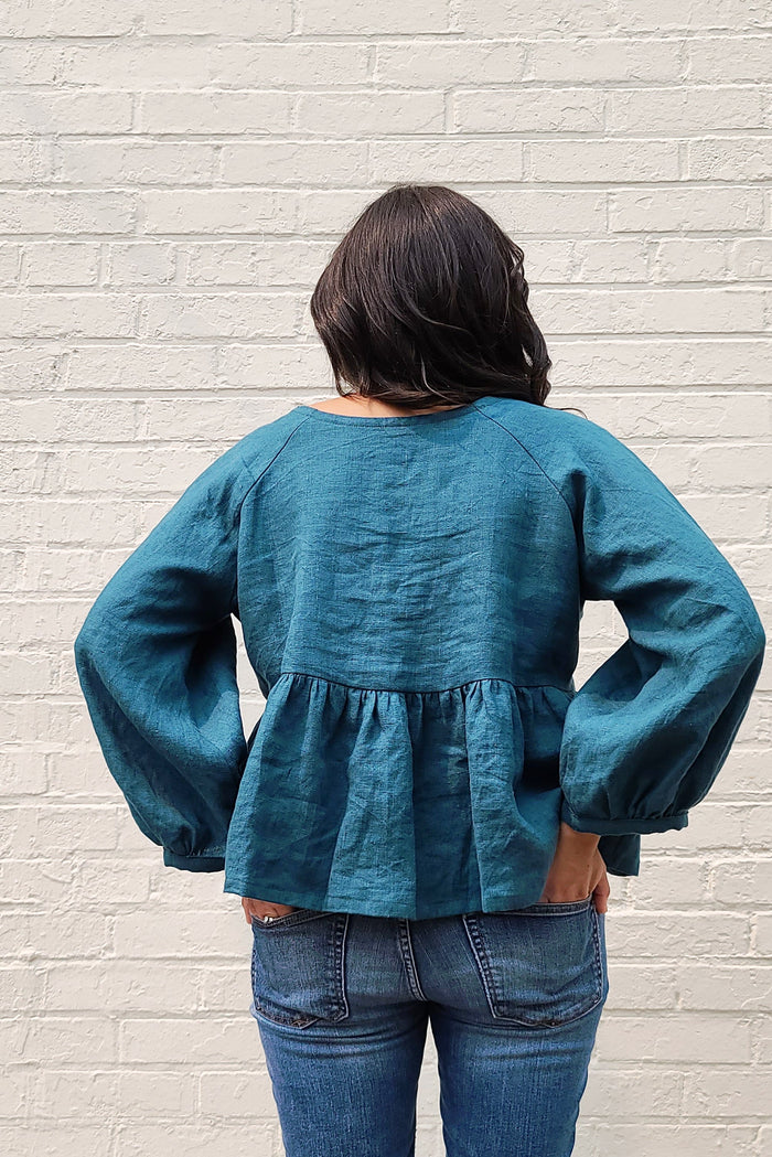 This is a centre-seamed top with a keyhole front neck that features a button and loop closure, empire waist with a gathered skirt or peplum as well as billowy sleeves that are gathered into a narrow 'above the waist' cuff. The Romey comes in three lengths: