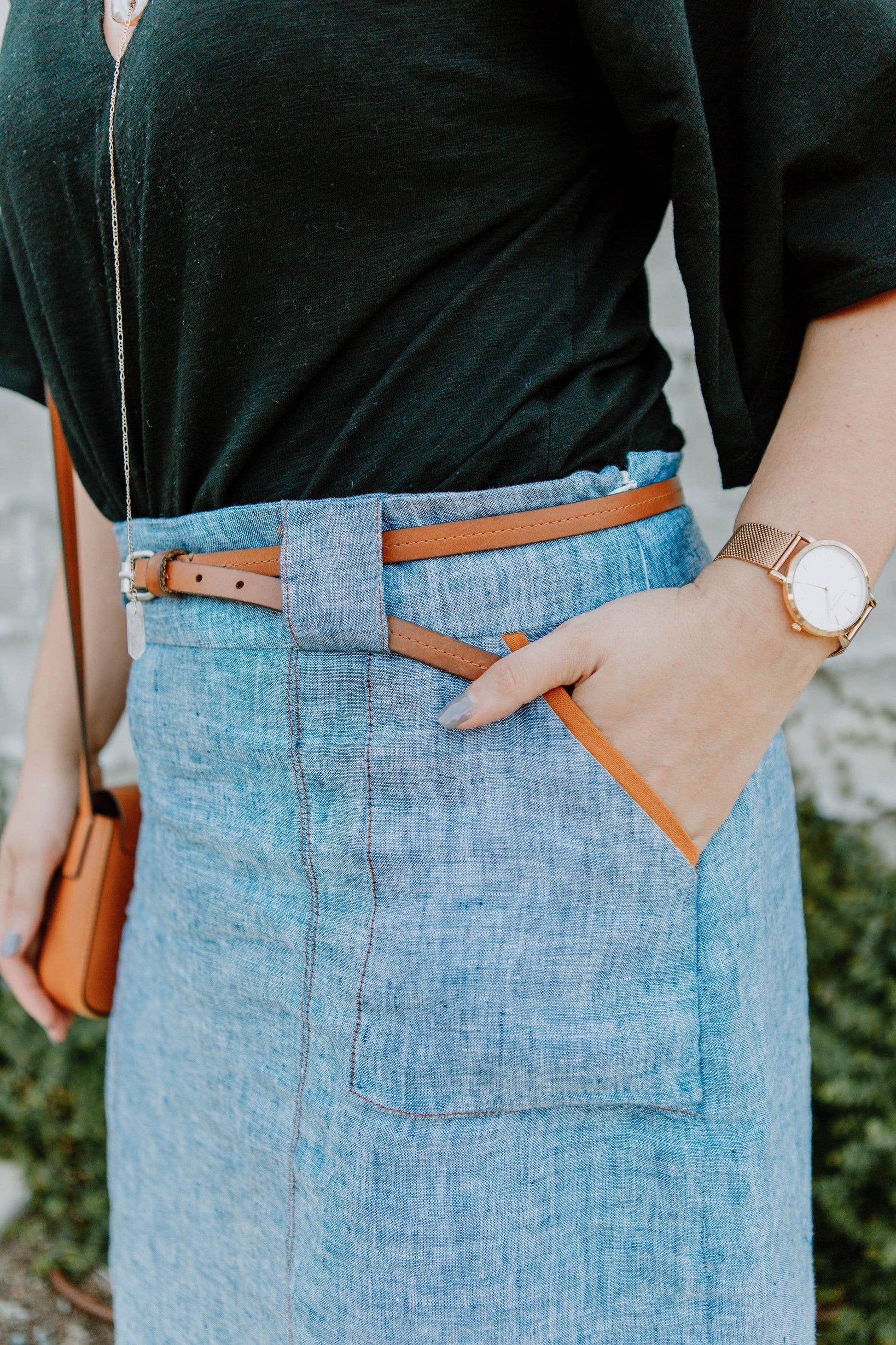 It's a simple shape skirt, but with lots of room to add personal touches like adding piping to the front panel or pockets.