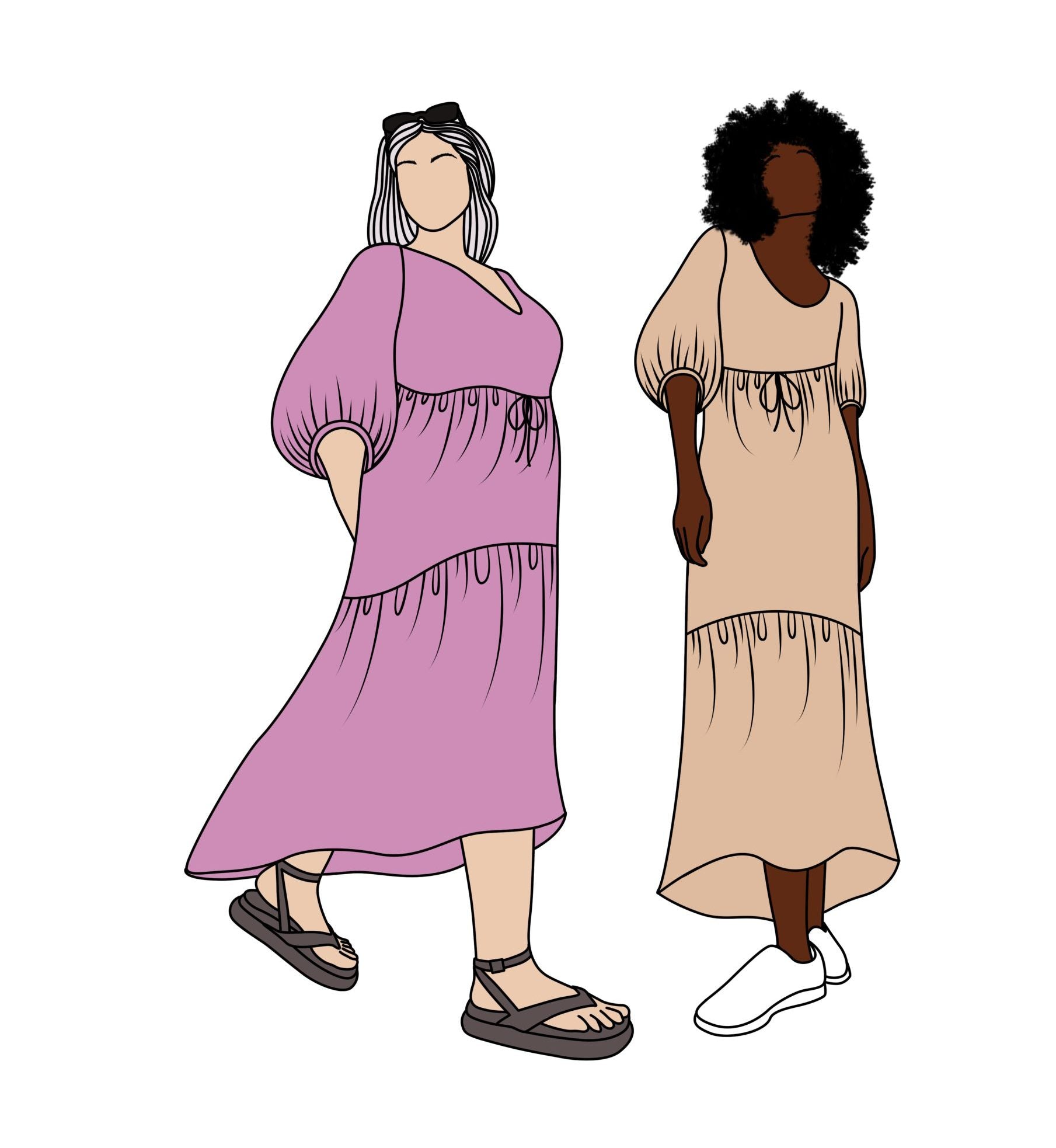 A floaty dress without the excess fabric. It gently hugs the bust and hips, ending at a high/low gathered flounce. Both round and v- neck options are included