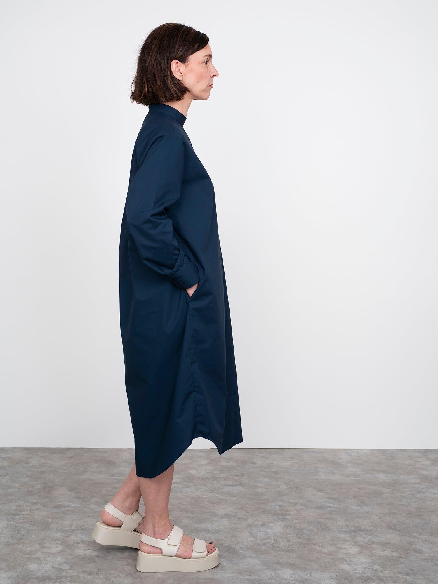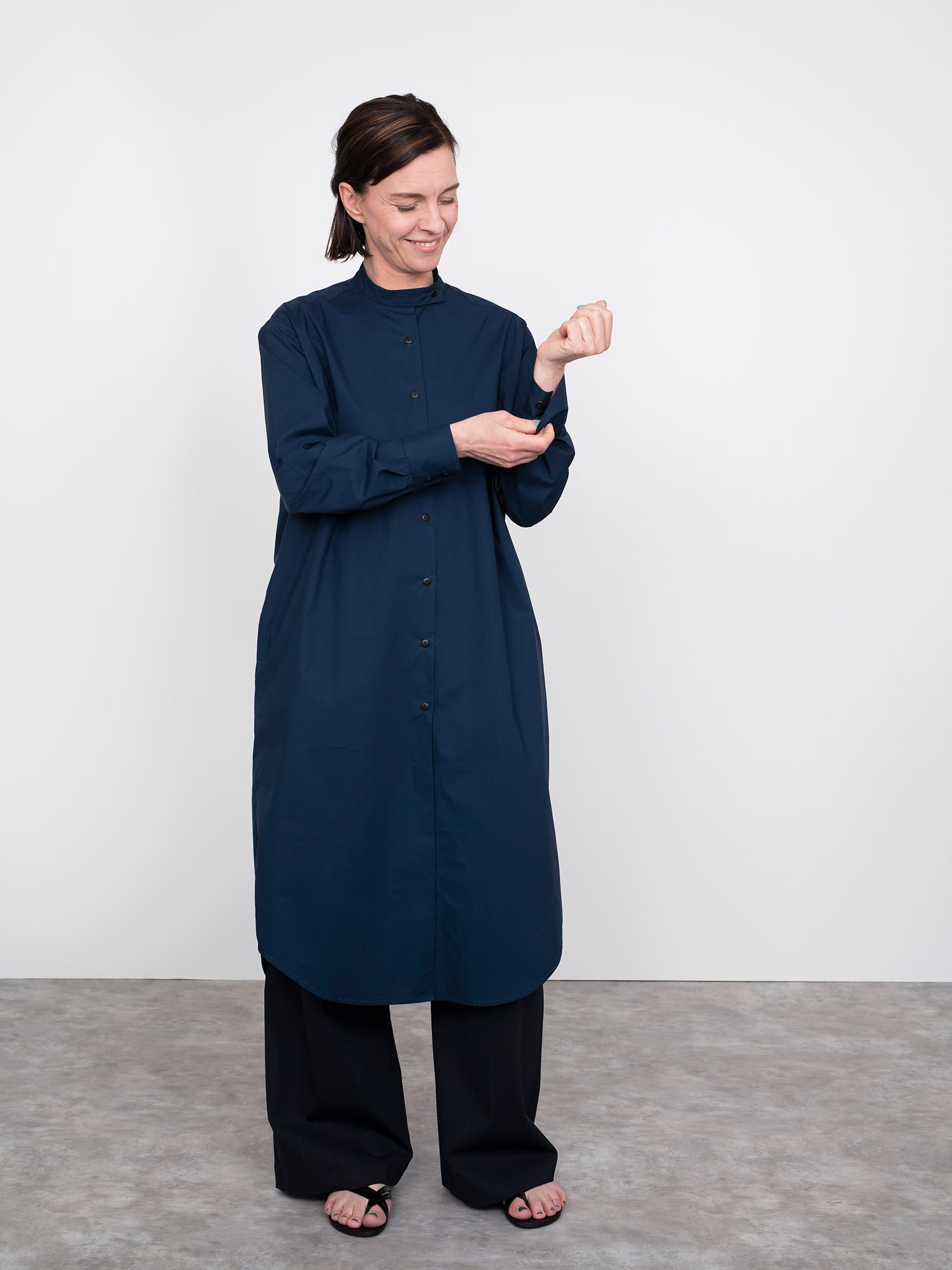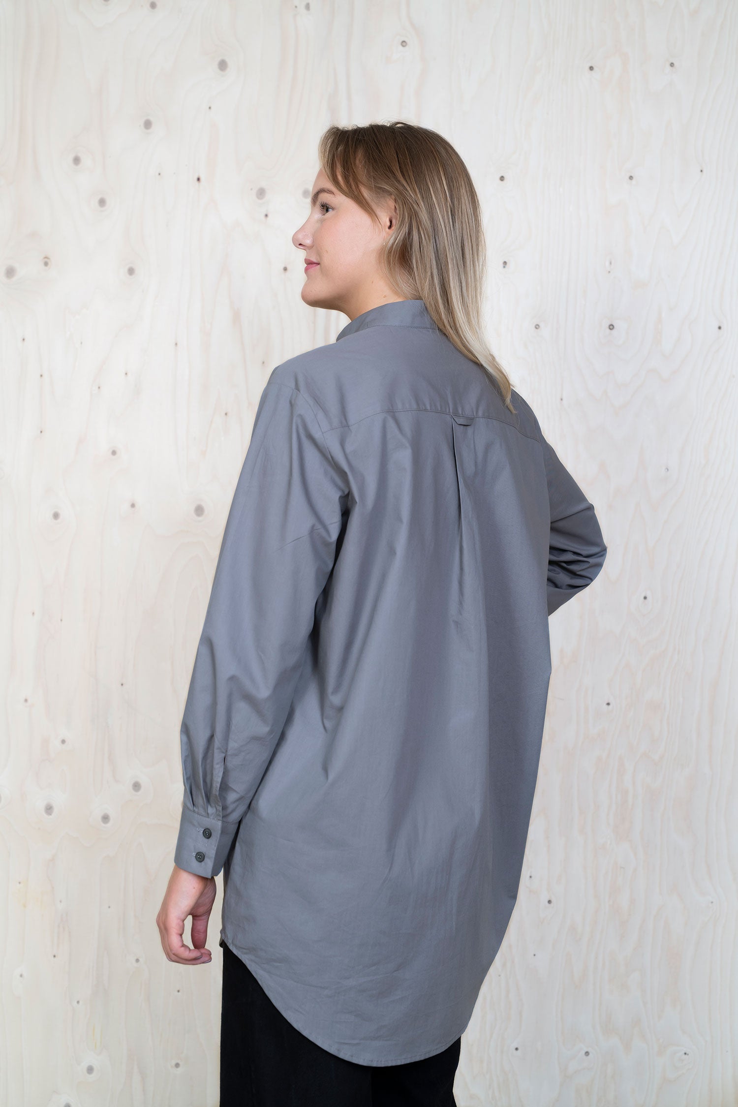The Oversized shirt sewing pattern by The Assembly Line is based on a classic style but with an oversized fit. It features relaxed shoulders, a traditional shirt collar or standing straight collar, a rear box pleat and side seam pockets.
