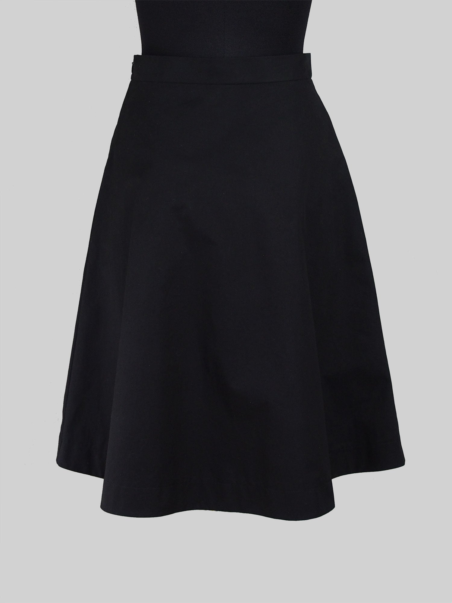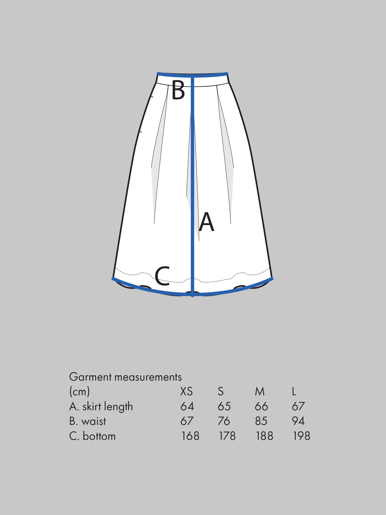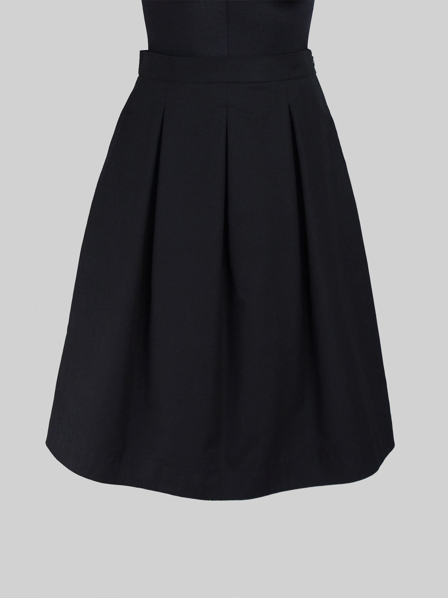 Suggested fabrics are mid to heavy weight fabrics such as denim, cotton twill, lightweight canvas. The skirt shown is sewn in black plain weave.
