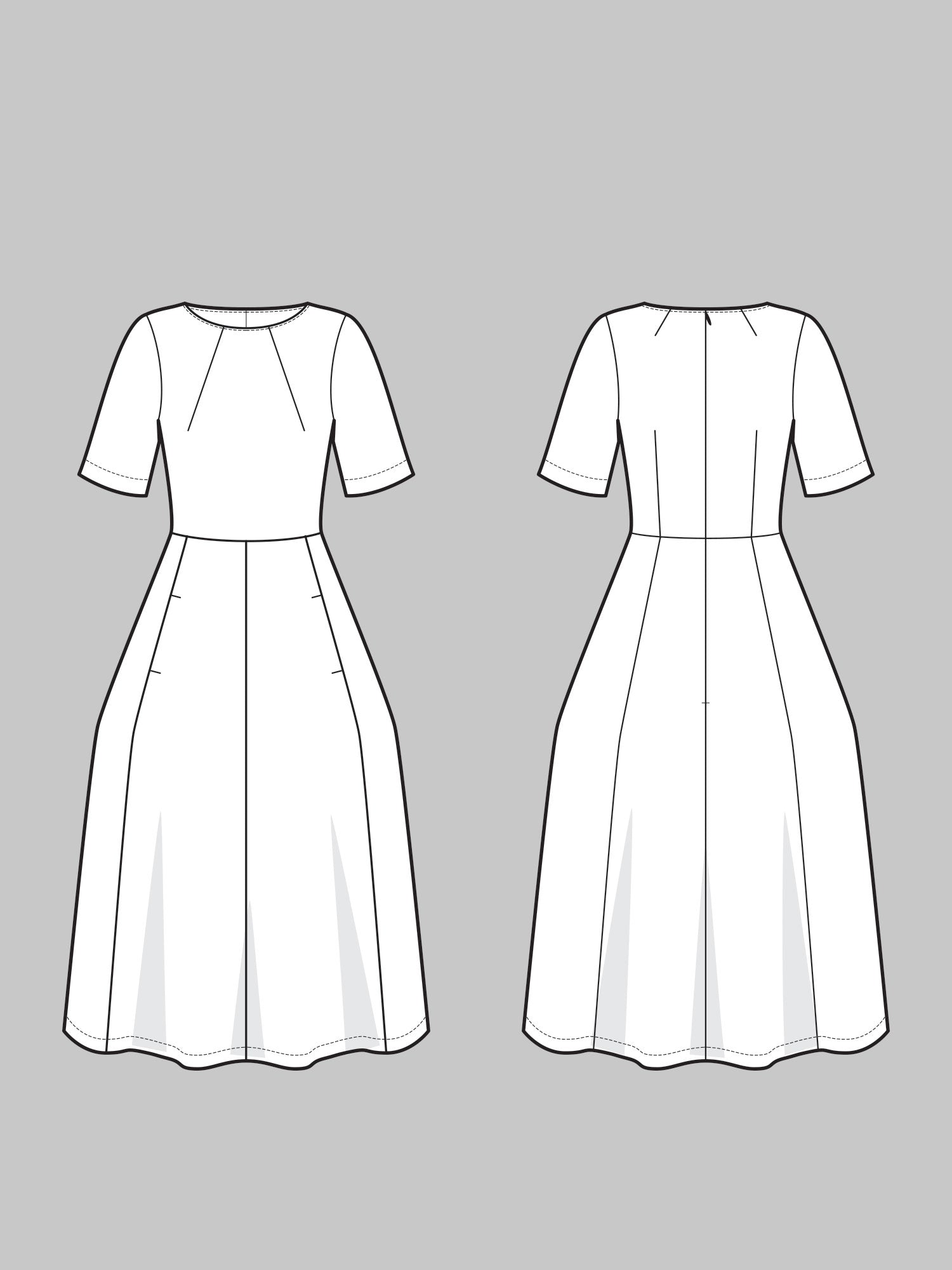 The dresses shown are sewn in navy plain weave and black stonewashed ramie.