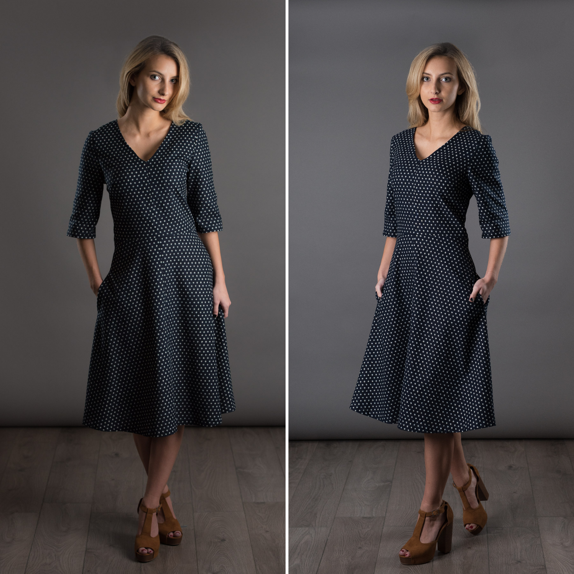 A-Line Dress by The Avid Seamstress is a stunning A-line dress that creates a classically flattering silhouette with a zip at the back. Featuring a fitted bodice, loose sleeves and sophisticated V-neckline, this garment will add timeless elegance to any wardrobe.Optional inner pockets and short/long skirt variations included. Cover image in long skirt version