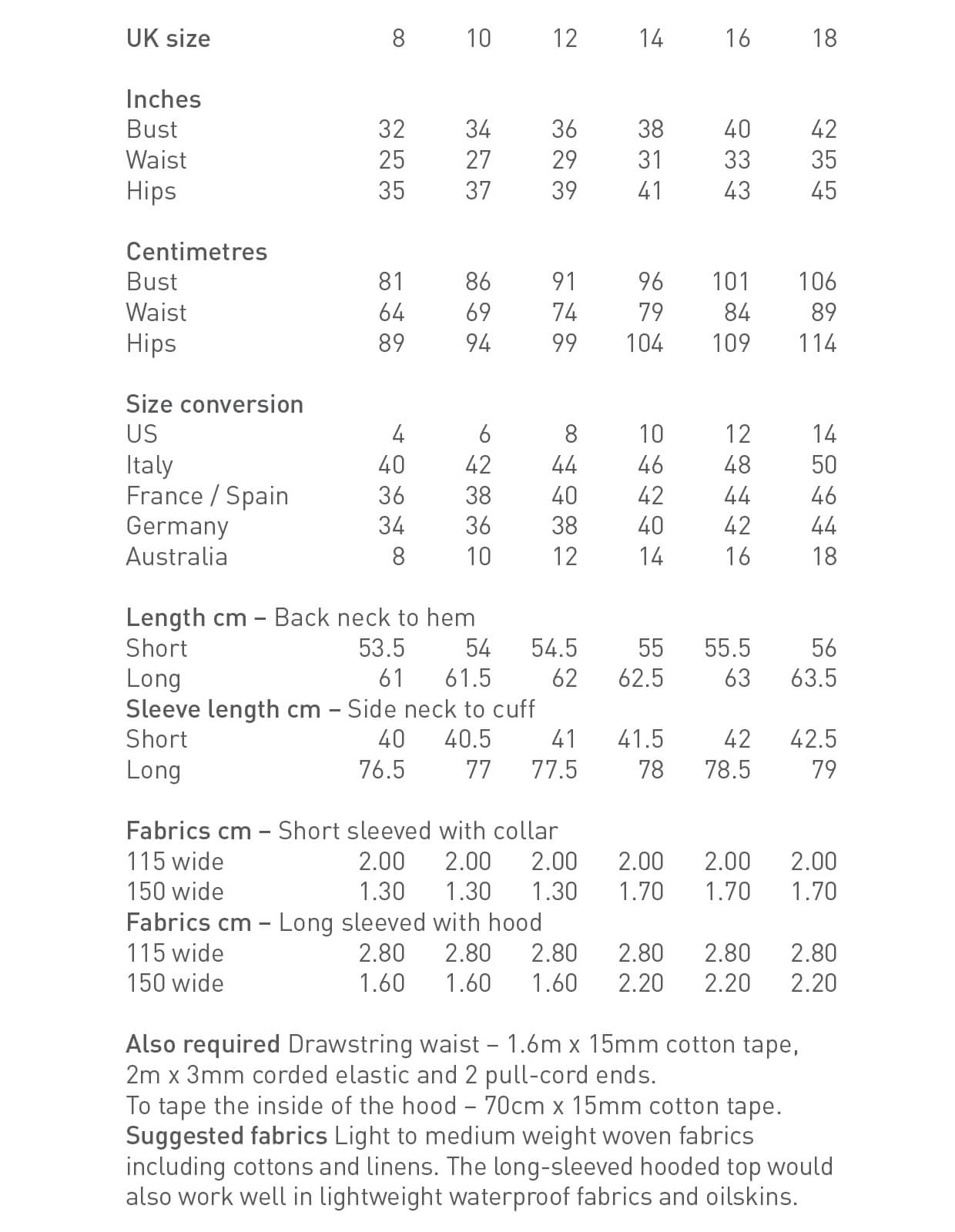 A versatile pattern for an easy-to-wear pull-on top in two lengths, with options for short or long sleeves, collar or hood and with or without drawstring waist.