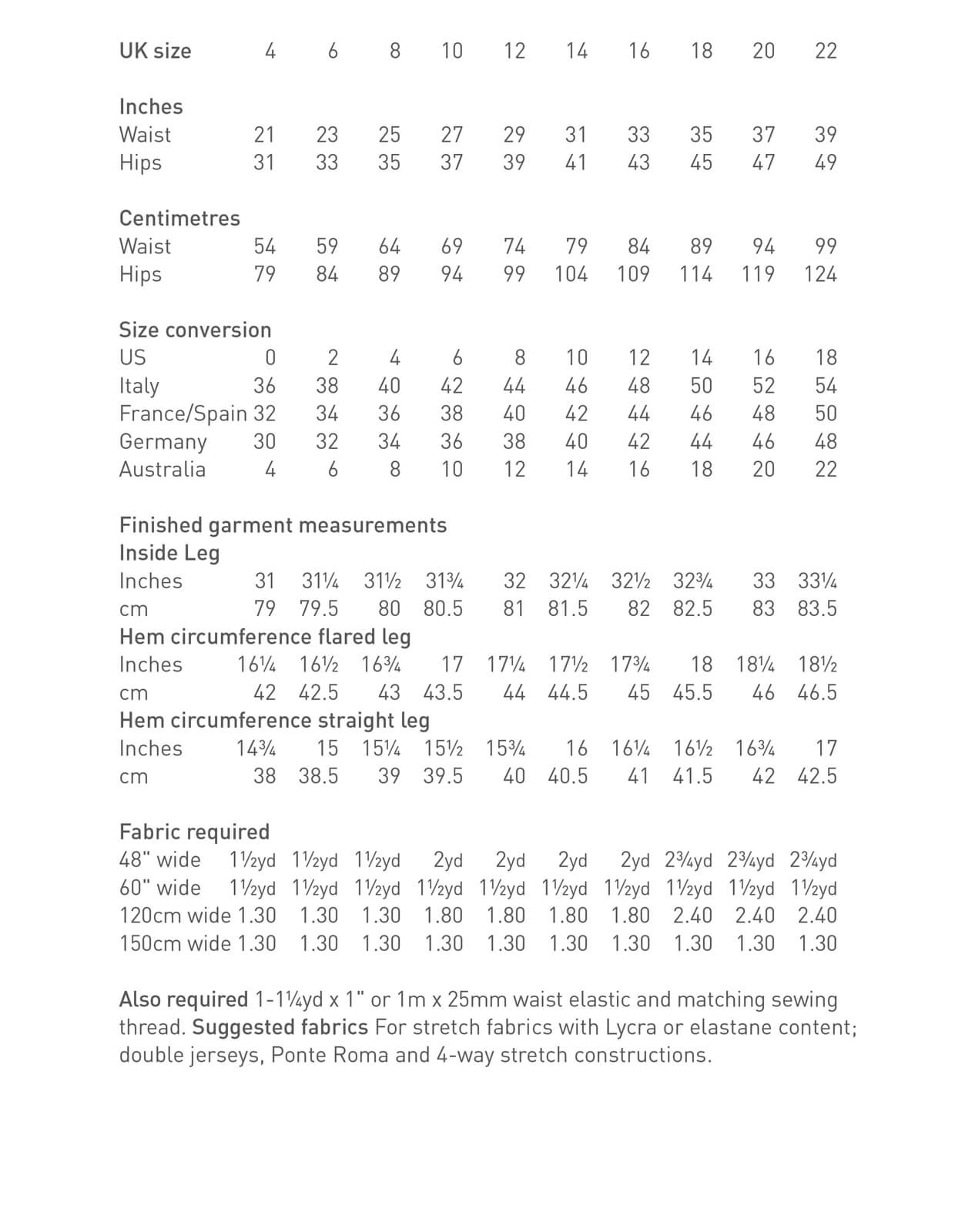 Specially designed for stretch fabrics, this simple pull-on trouser comes in two leg shapes.