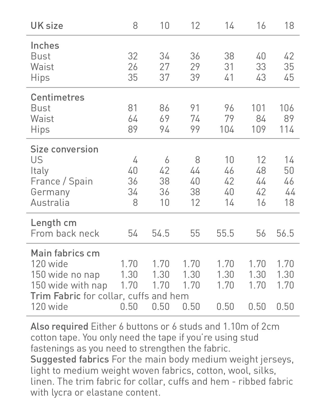 Main fabric: medium weight jerseys, light to medium weight woven fabrics including cotton, wool, silk linen. Trim: ribbed jersey or ponte with Lycra or elastane content