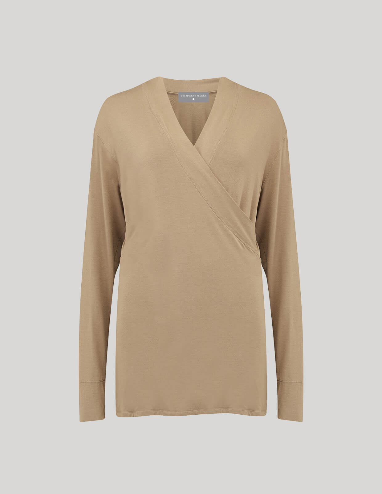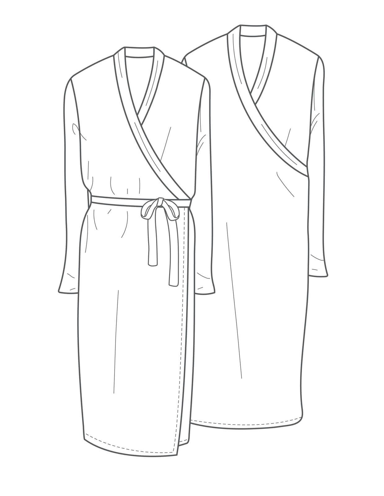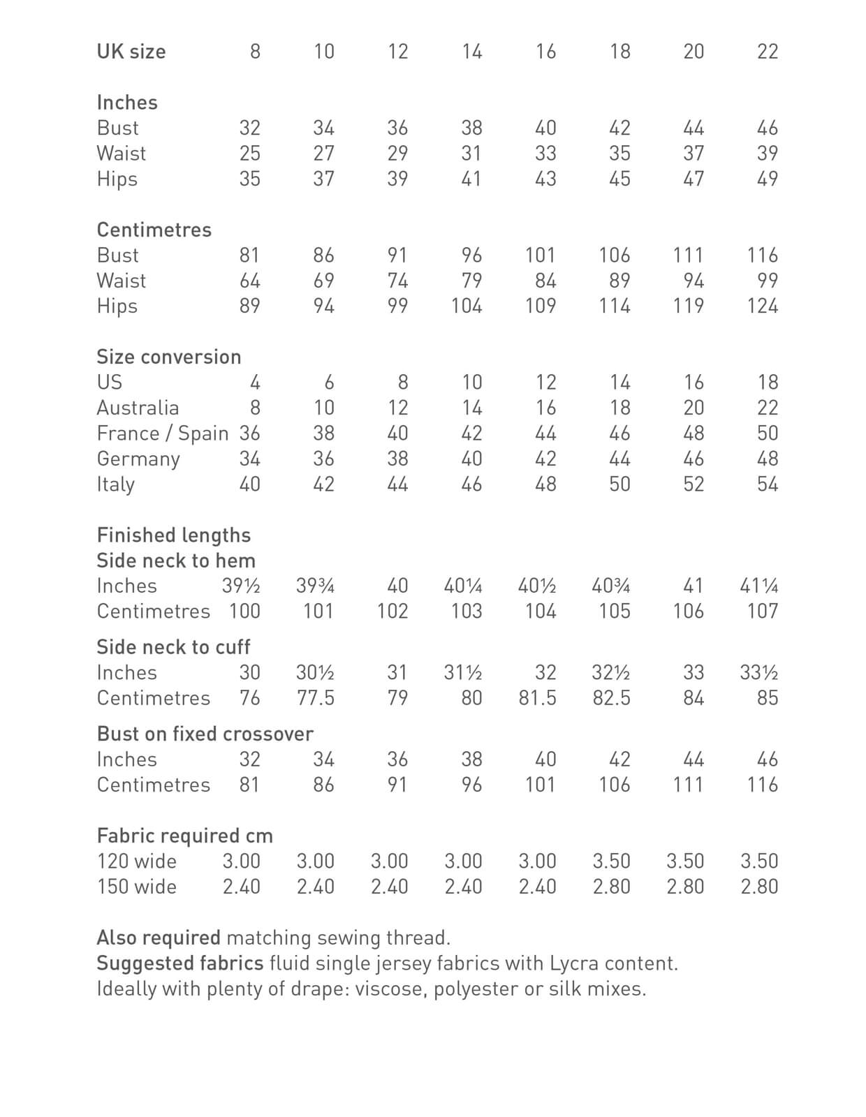 The perfect wrap jersey dress in two versions – wrapped and tied or with a fixed crossover front. The crossover is cut high to avoid gaping at the cleavage. While the sleeves are designed to be fashionably overlong, but look just as good worn on the wrist. This style works equally well as a top.